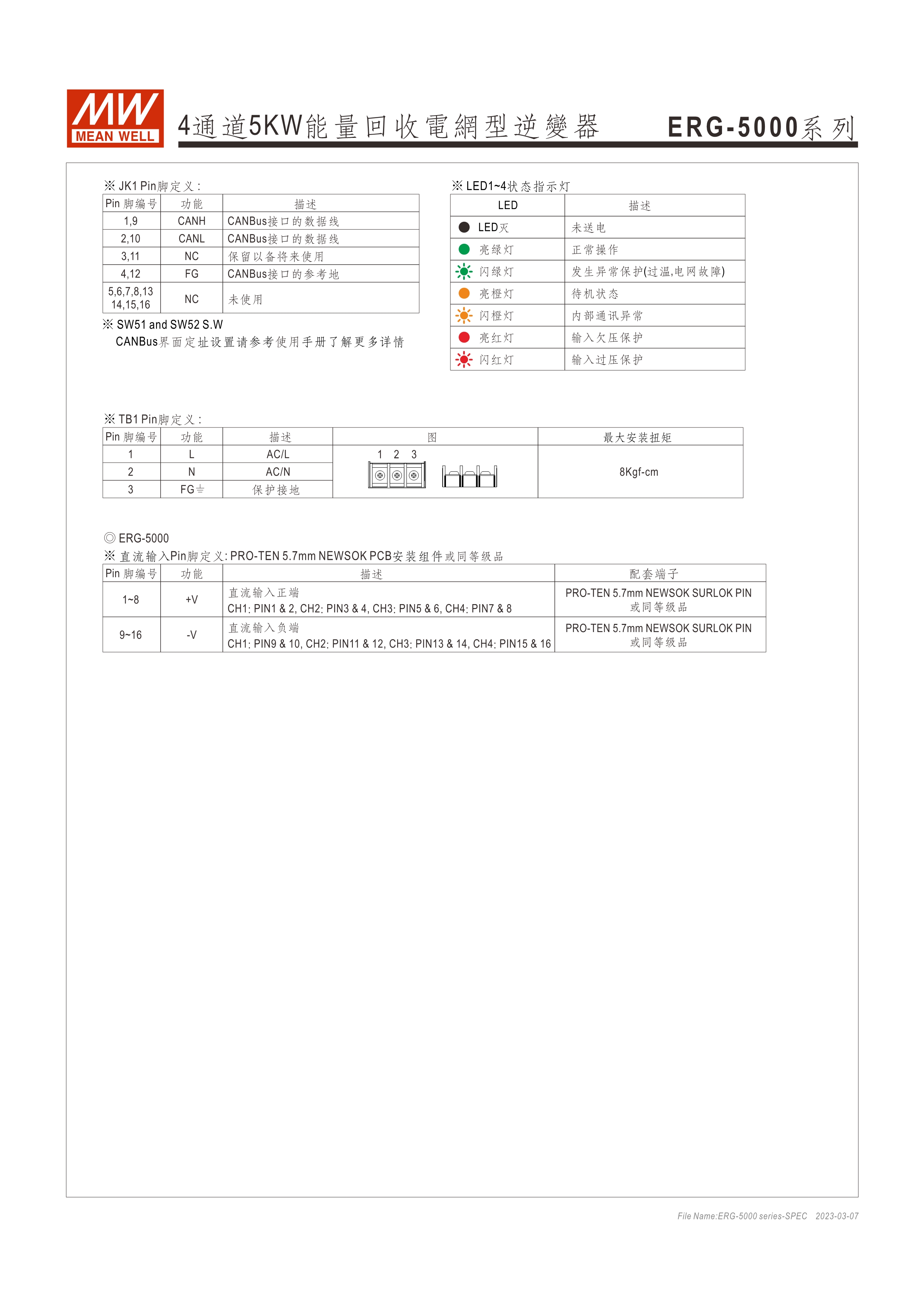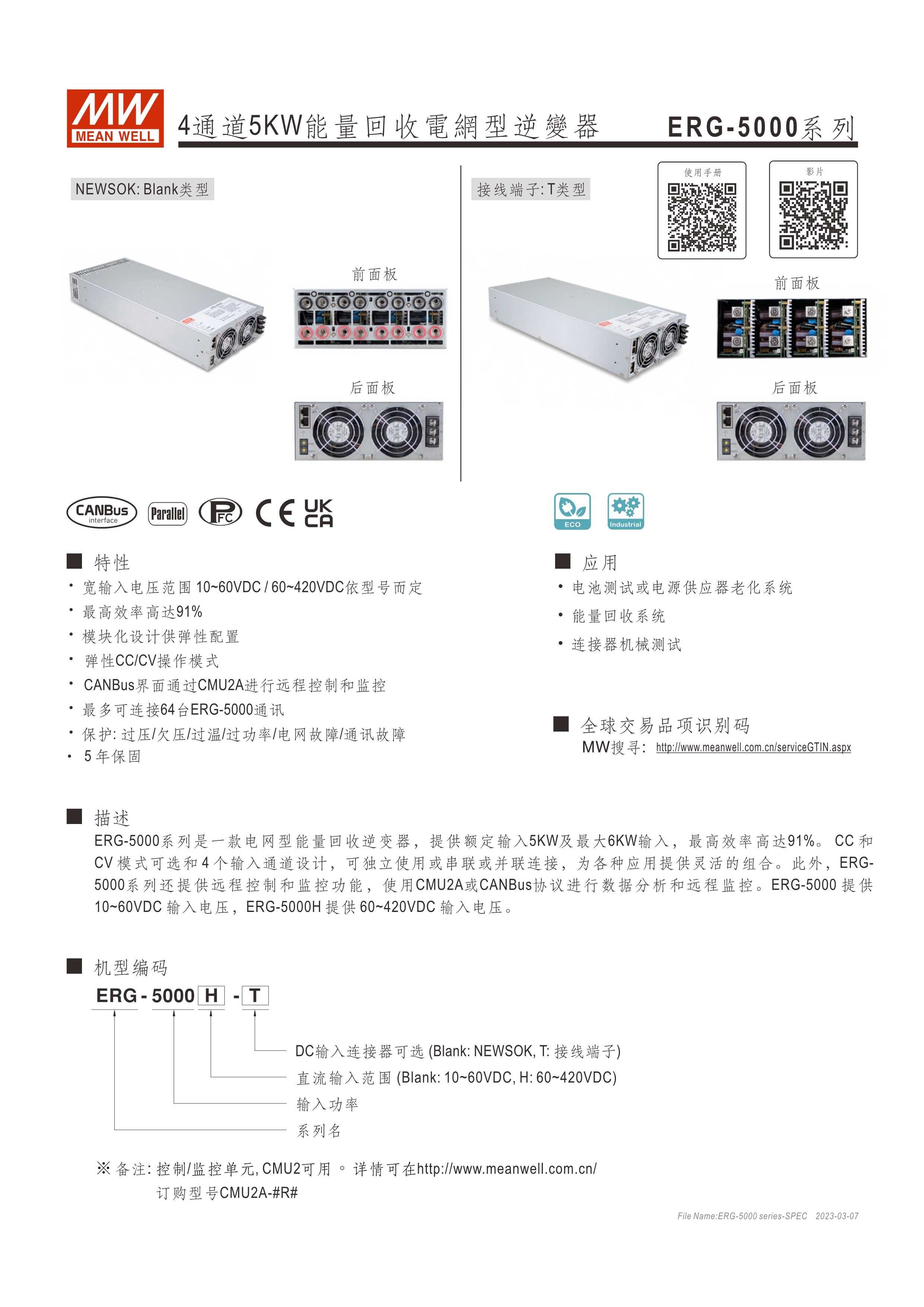 系統(tǒng)電源解決方案 (PDF) 寬輸入電壓范圍10~60VDC/寬輸入電壓范圍60~420VDC 效率高達(dá)91% 靈活配置的模塊化設(shè)計(jì) 彈性的CC/CV操作模式 通過CMU2A實(shí)現(xiàn)CAN總線協(xié)議遠(yuǎn)程控制和監(jiān)控控制 可連接最多64個(gè)ERG-5000系列 保護(hù)功能:過電壓、欠電壓、過熱、過功率、電網(wǎng)故障、過功率無輸入、通信錯(cuò)誤 3年保固