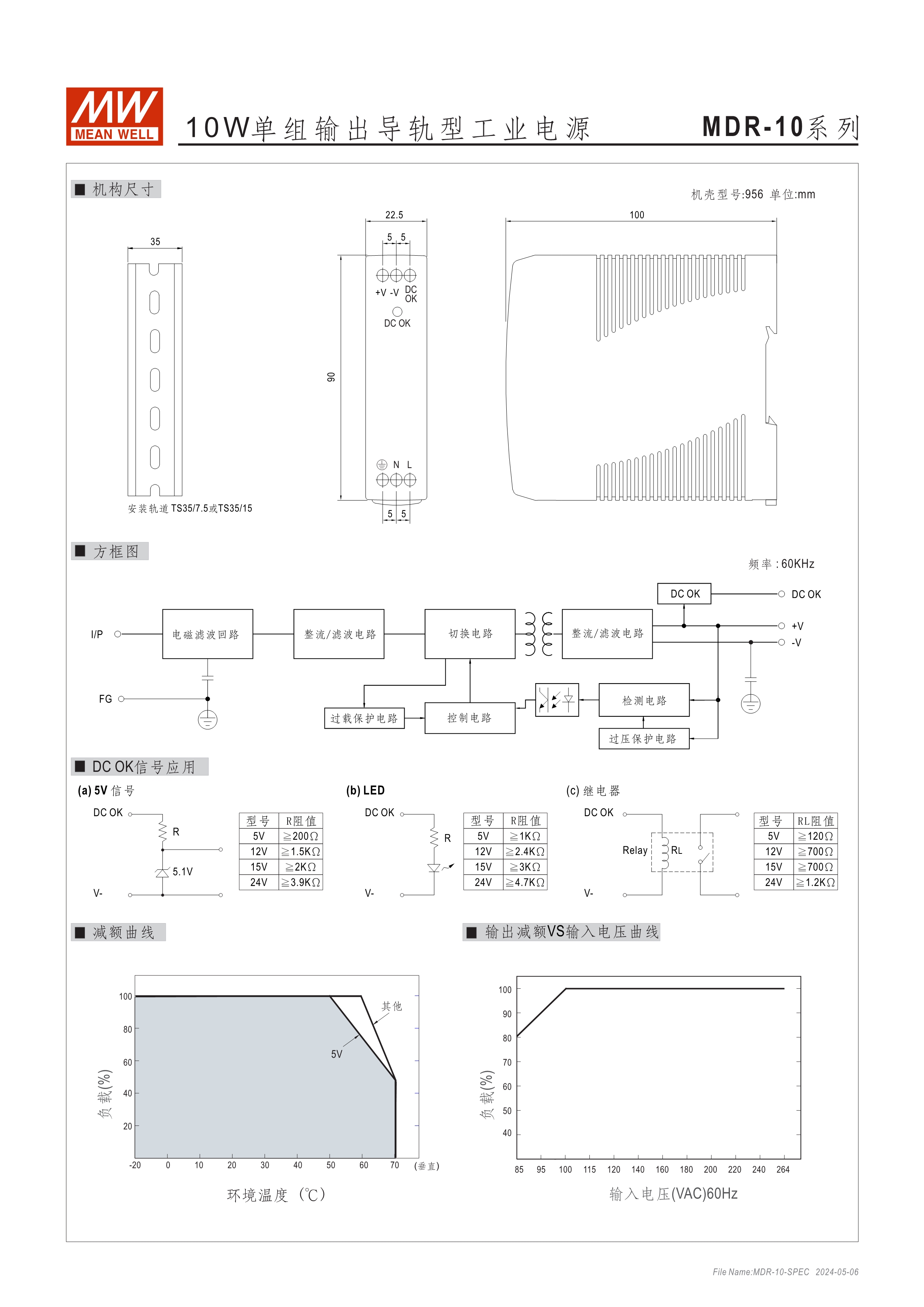 超薄型塑料機(jī)殼 單相,全范圍輸入 空載待機(jī)消耗瓦數(shù)<0.75W~1W 適合安裝于DIN rail TS-35 / 7.5 或 15 內(nèi)建主動(dòng)式功率因子矯正功能(active PFC) DC OK訊號輸出(MDR-10/20) DC OK繼電器接點(diǎn)(relay contact)信號輸出(MDR-40/60/100) 適用于Class I, Div 2 T4危險(xiǎn)區(qū)域(MDR-40/60)