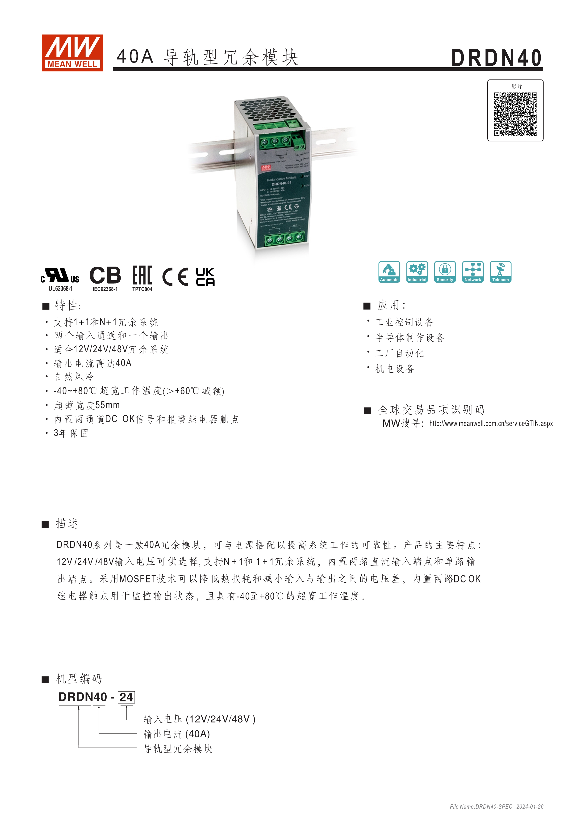 20A冗余模塊(Redundant Module) 20A/40A備援緩沖模塊(Buffer Module) 20A/40A DC UPS模塊(UPS Module) AC峰值電流抑制器