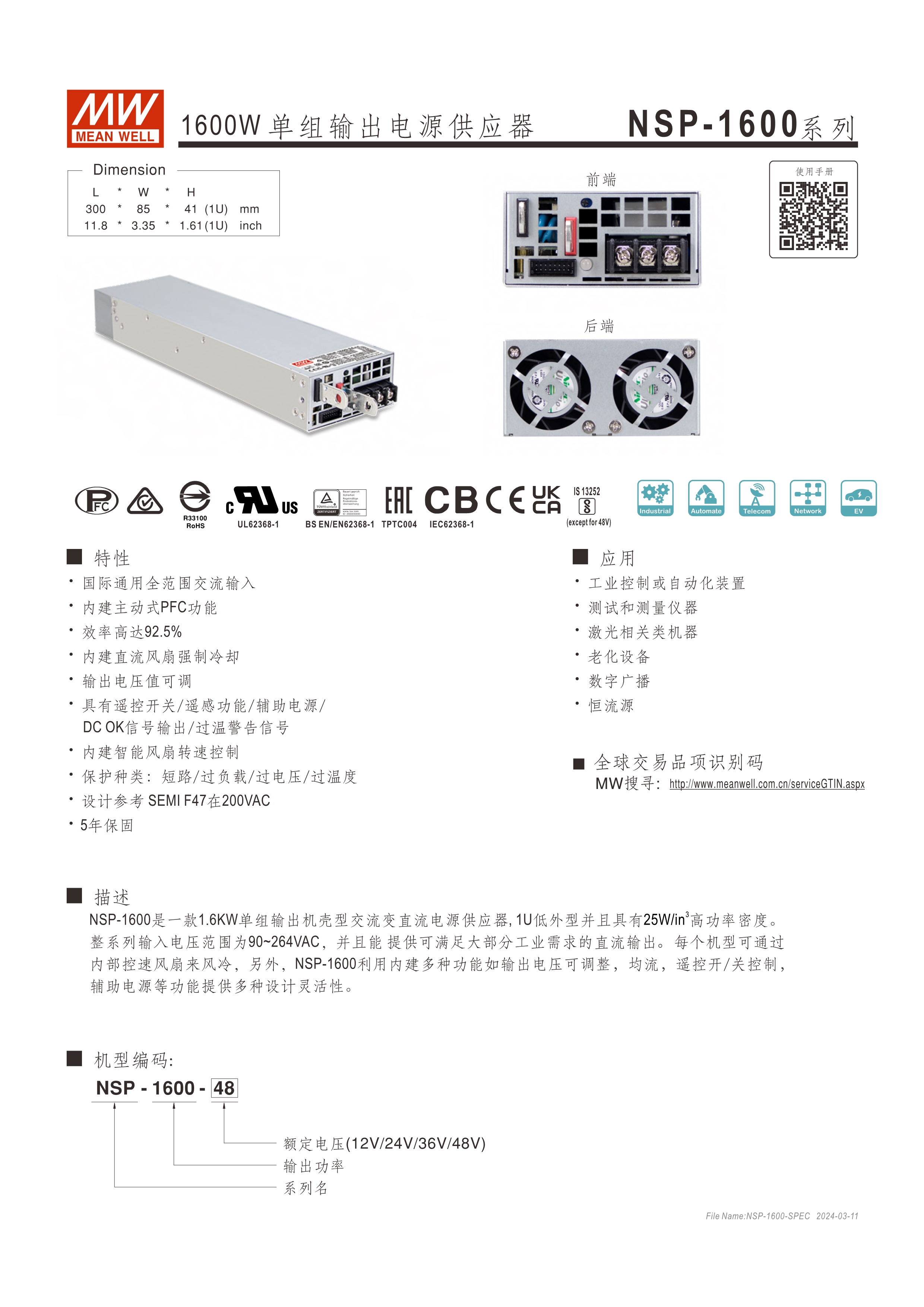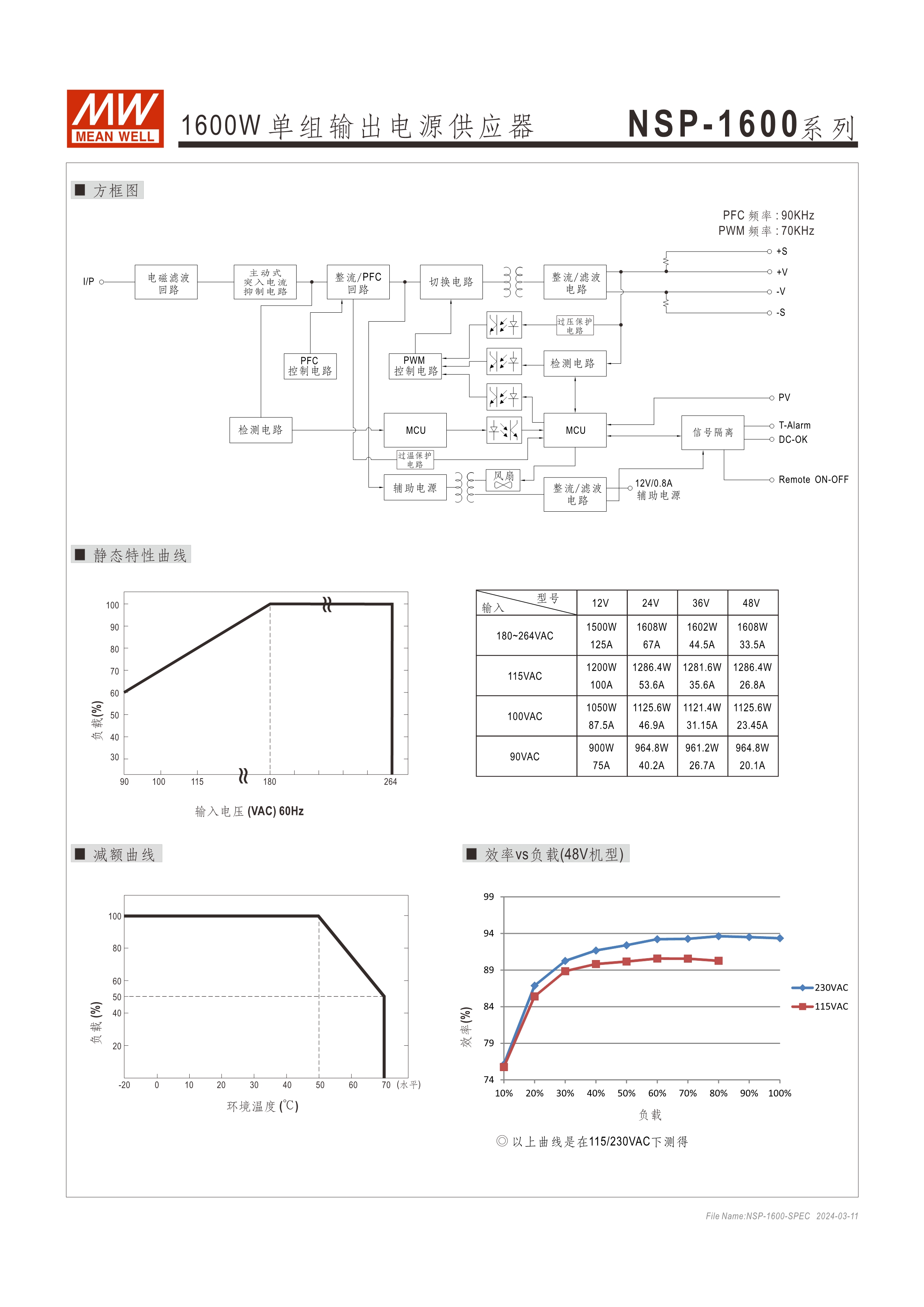 電氣規(guī)格及安規(guī)認證皆參照RSP或DPU系列,客戶可直接選用取代,立即導入使用 環(huán)境友善制程與用料 全范圍電壓輸入 效率最高可達94.5% 內建PV功能 設計符合SEMI F47 @200Vac