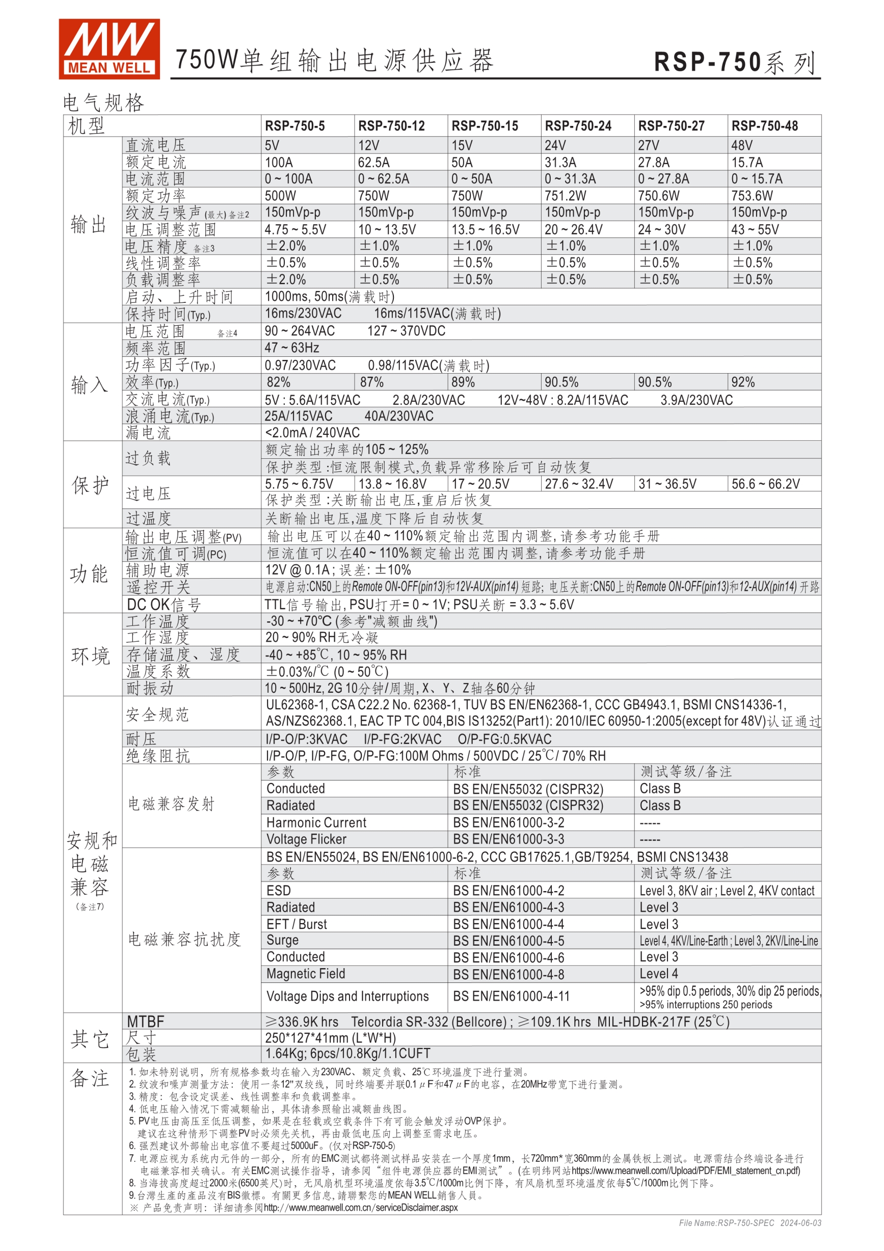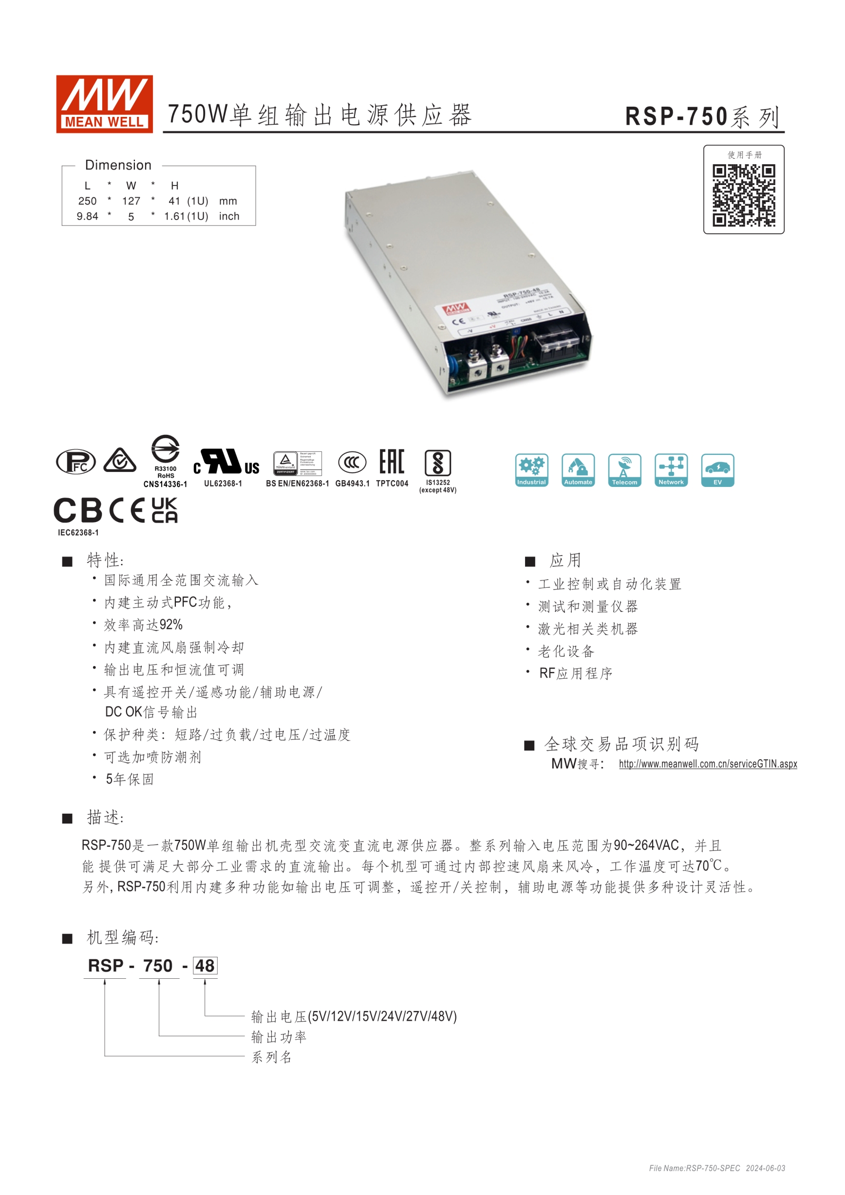 內(nèi)建主動(dòng)式功率因子矯正功能(active PFC) 輸出電壓可程序 輸出電流(Icc)可程序 (RSP-750/1600 only) RSP-750/1000/1600/2000為1U(41mm)低高度設(shè)計(jì),(RSP-1500/2400/3000為2U) 內(nèi)建主動(dòng)式并聯(lián)功能(除RSP-750) 5年保固期