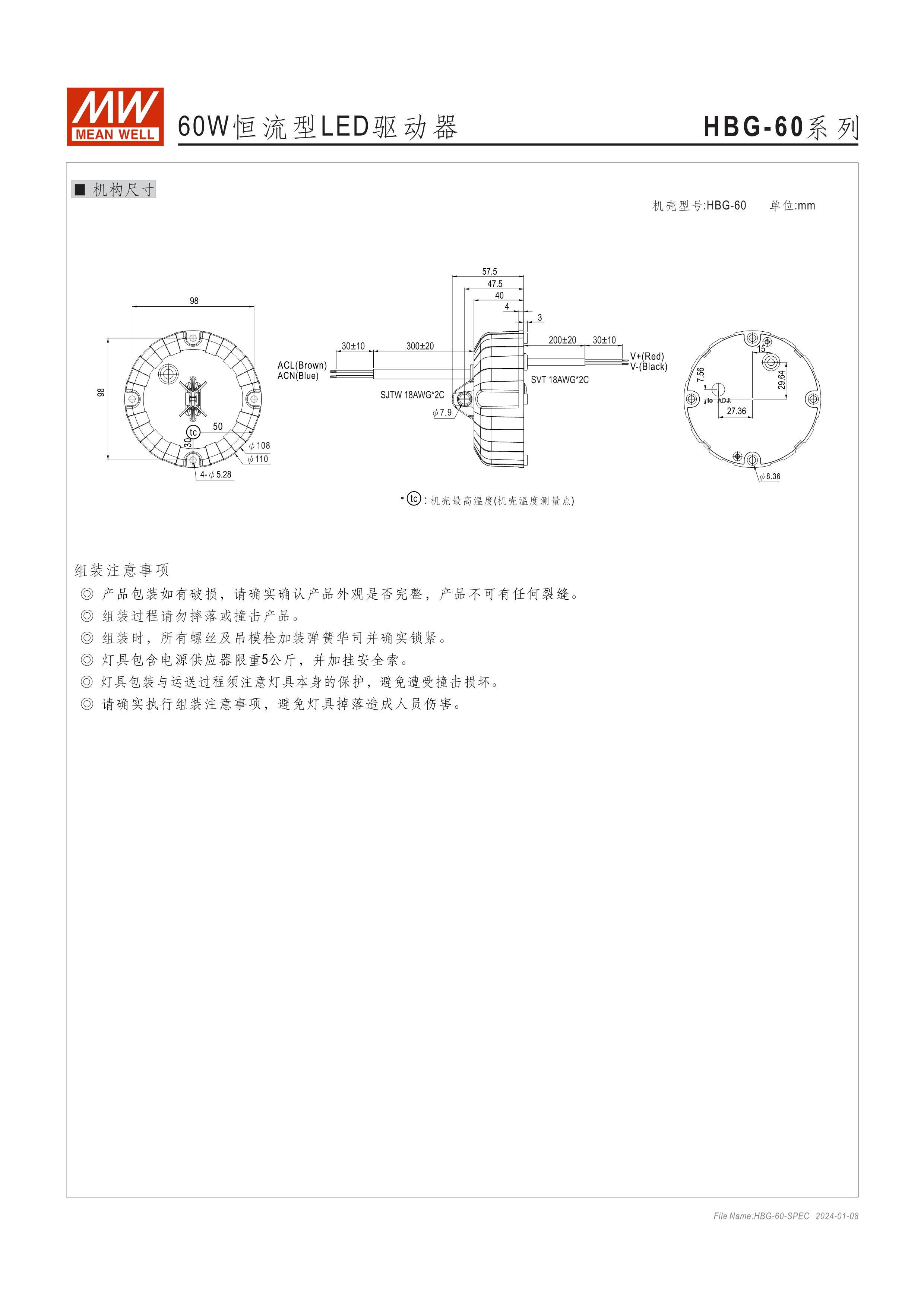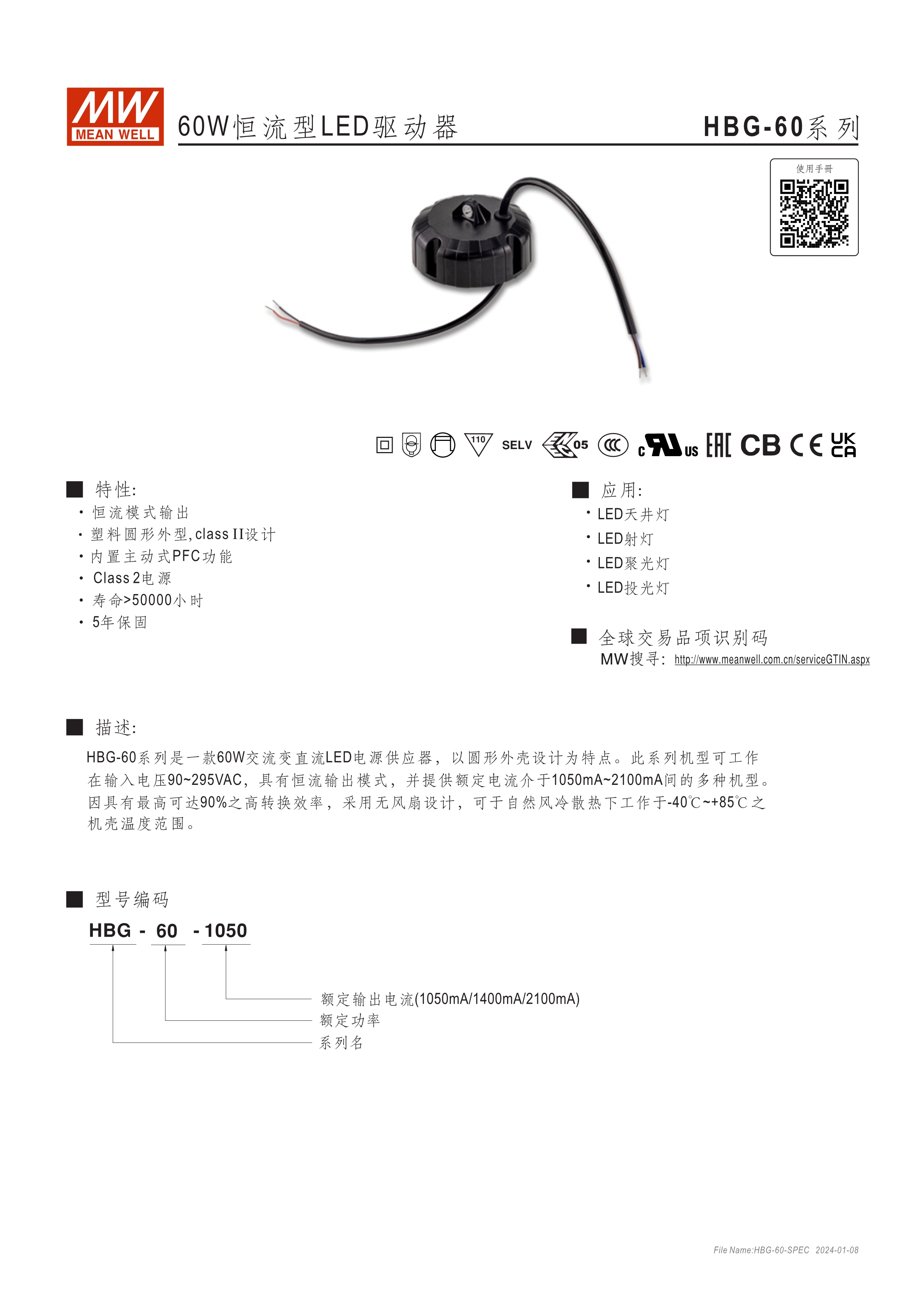 圓形外殼設(shè)計(jì) : HBG-60 :塑料外殼; HBG-100/160/240 :金屬外殼; HBG-60P/100P/160P/240P : PCB板型 90~305VAC交流輸入(HBG-60為90~295VAC), 內(nèi)建主動(dòng)式功率因子矯正功能(active PFC) IP67/IP65防護(hù)等級(jí)可用于戶(hù)外與室內(nèi)(HBG-100/160/240) HBG-100(P)/160(P)/240(P) B Type機(jī)種內(nèi)建三合一調(diào)光功能 (1~10VDC,PWM信號(hào)或電阻) Type "HL" LED電源適用在安裝于Class I, Division 2 類(lèi) 危險(xiǎn)地點(diǎn)之照明燈具(HBG-100/160) 適合于LED天井燈、舞臺(tái)燈、投光燈等照明應(yīng)用 5年保固期