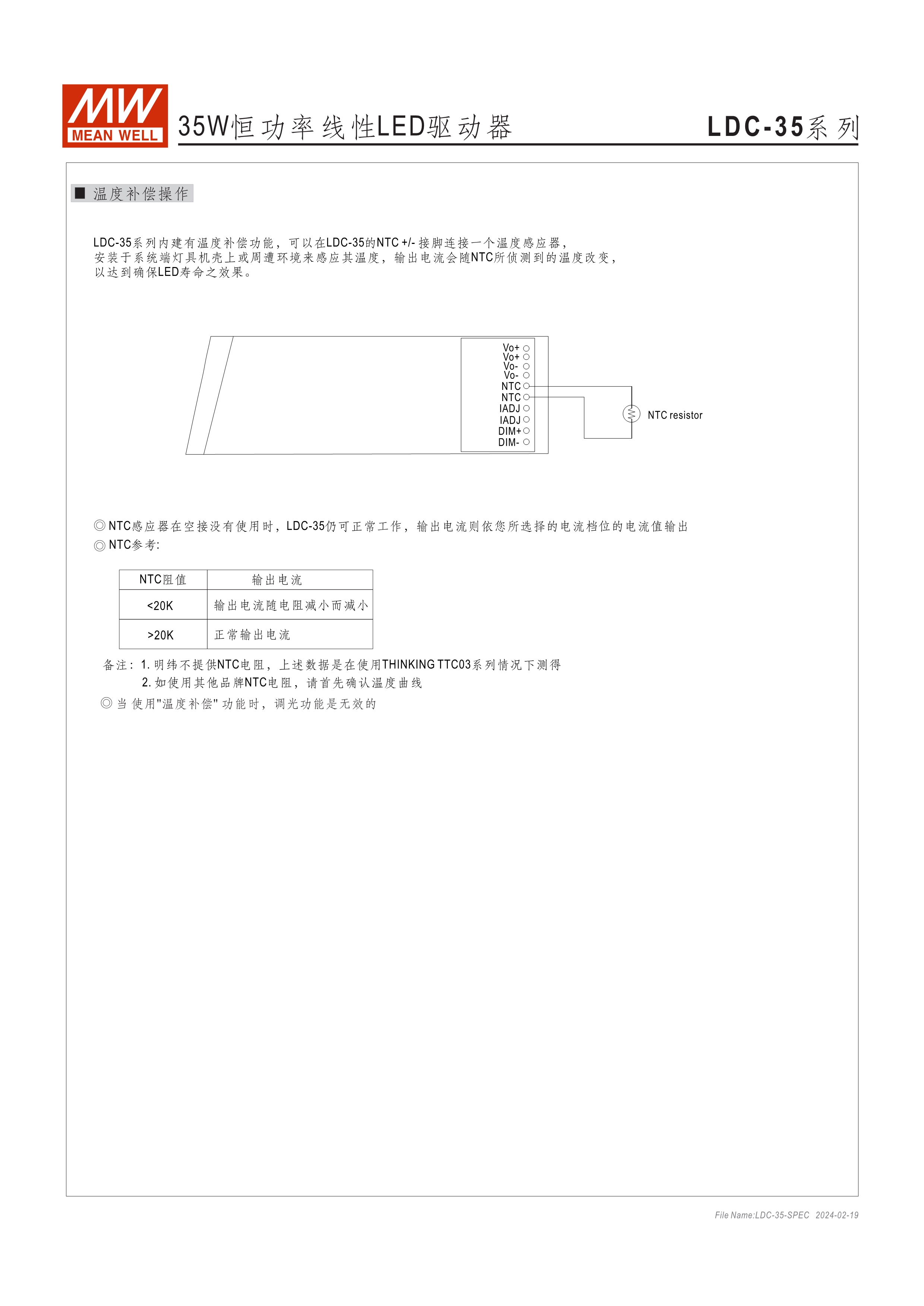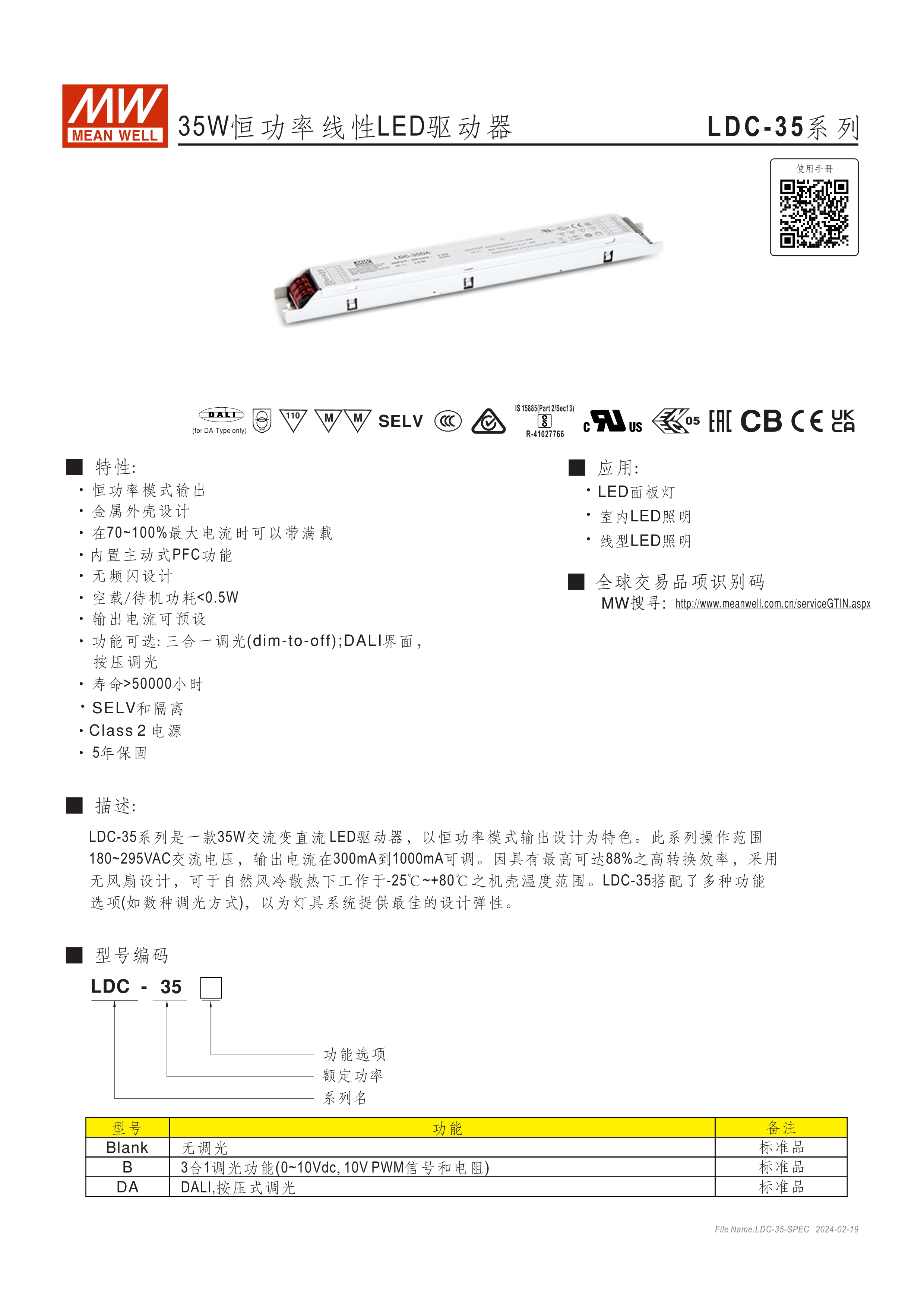 恒功率模式輸出,輸出電流可通過外接電阻設(shè)定 無頻閃設(shè)計(jì)(Fpcker free) 三合一調(diào)光功能:0~10Vdc、PMW調(diào)光、電阻調(diào)光 內(nèi)建主動式功率因子矯正功能(Active PFC) 低空載功耗: <0.5W 工作溫度: -25~+90℃ 保護(hù)種類:短路 UL/ENEC/TUV/CCC/CB/CE 認(rèn)證齊全 5年保固
