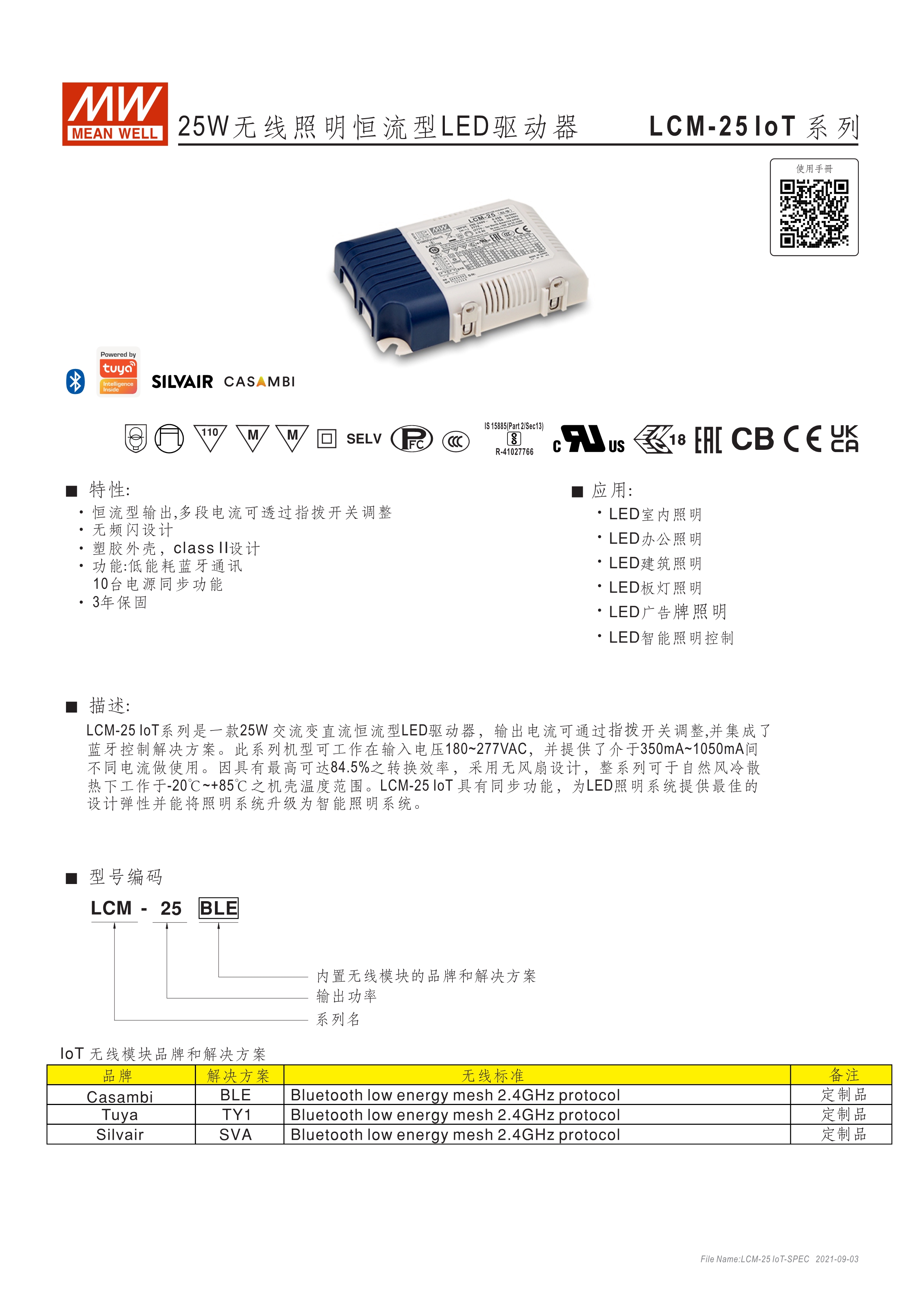 恒流輸出模式多段可選 無頻閃設(shè)計(jì) 塑料外殼及符合Class II無地線設(shè)計(jì) 主動式PFC設(shè)計(jì) 調(diào)光功能:全系列藍(lán)芽智能控制及Push Dim(僅LCM系列) 雷擊保護(hù)耐壓設(shè)計(jì)2KV(L-N) 保護(hù)功能:短路、過電壓、過溫度