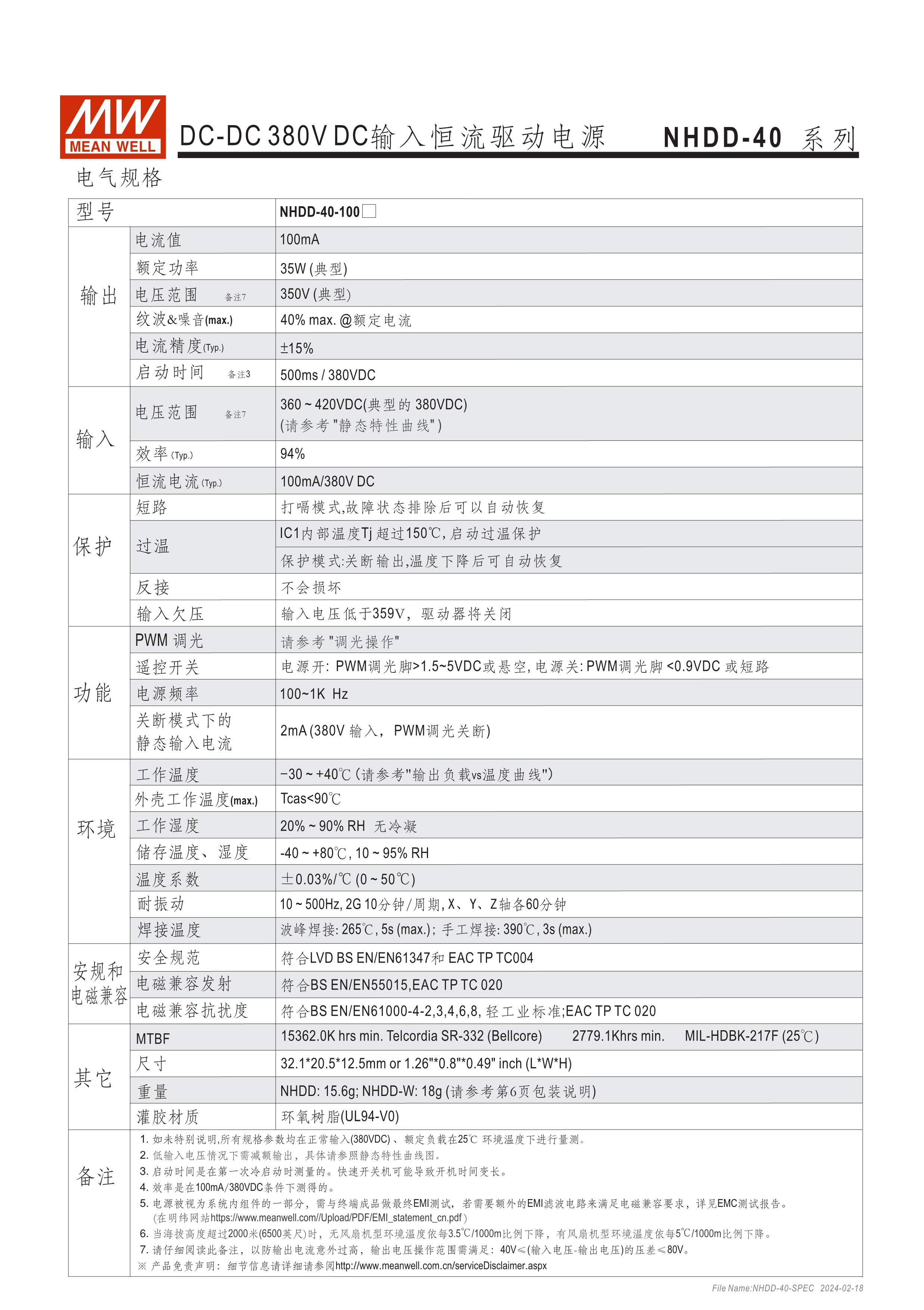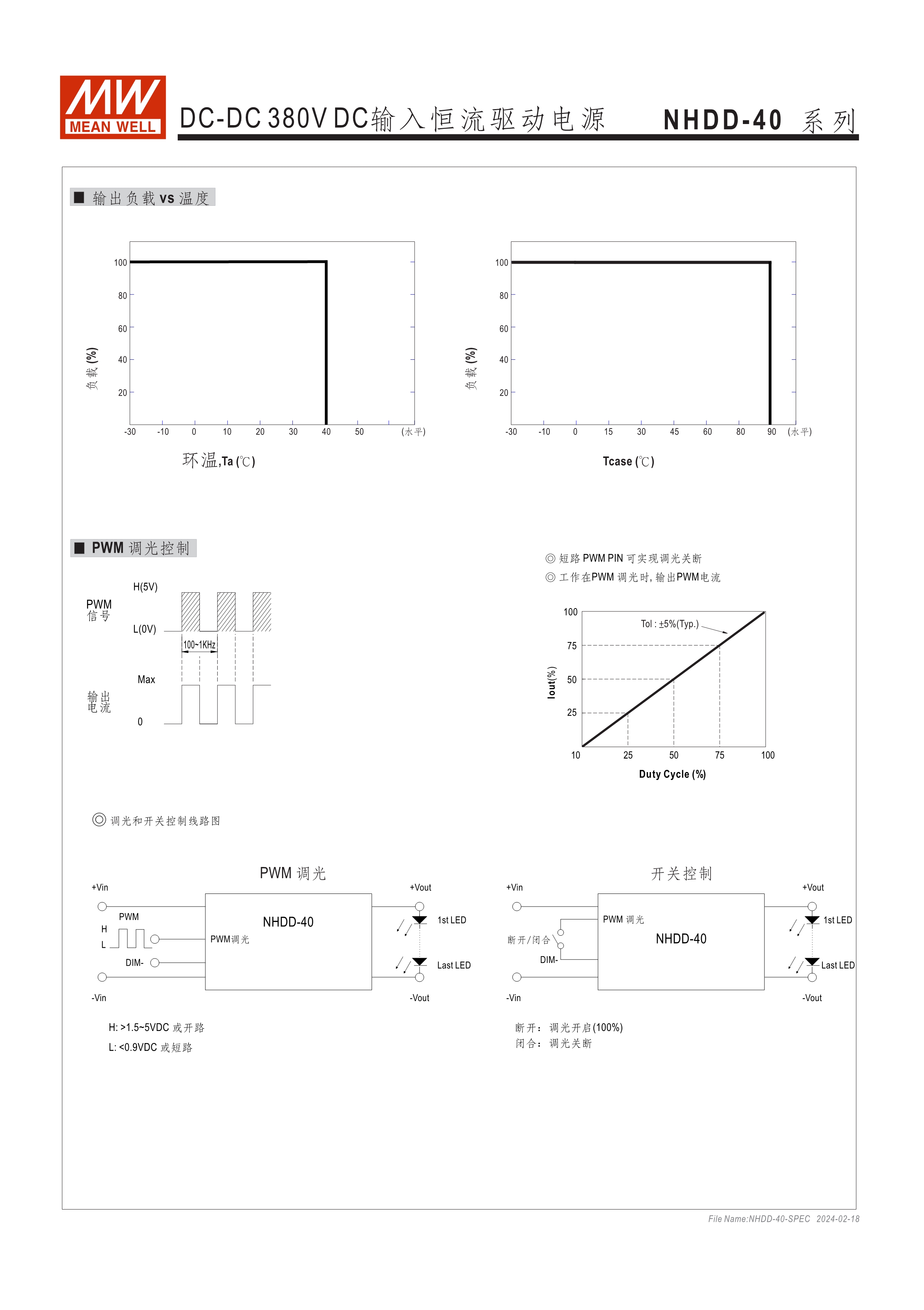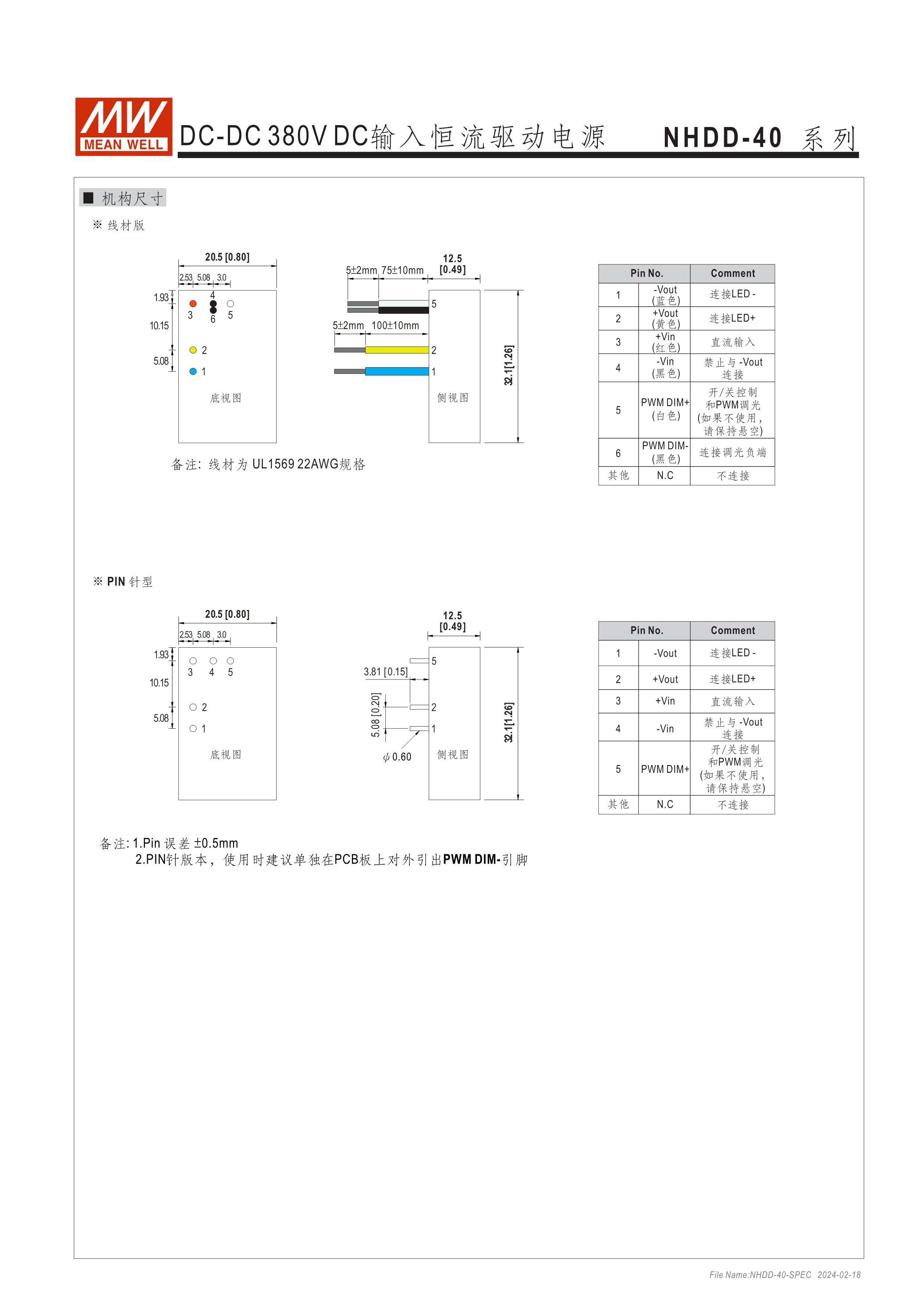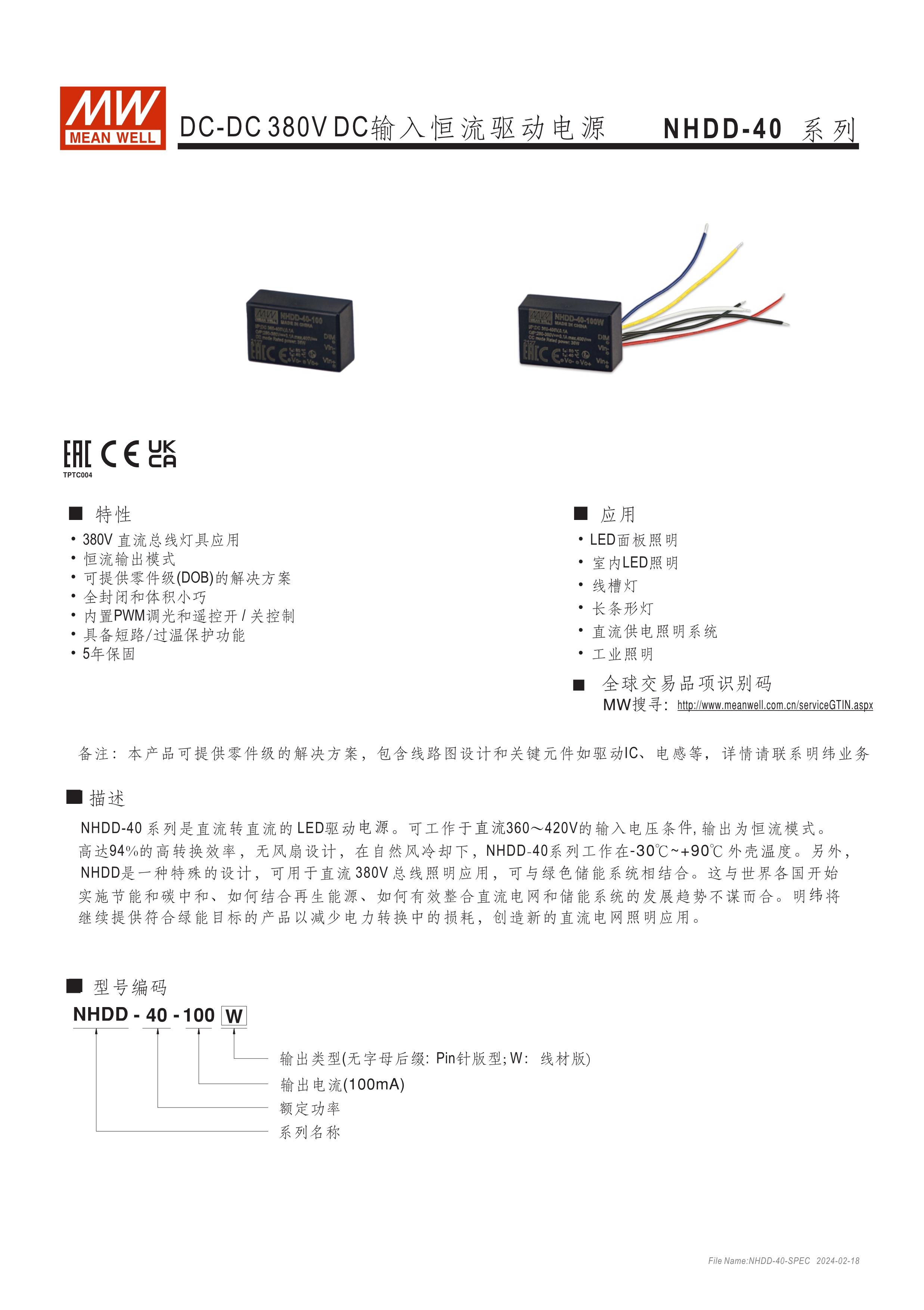 恒流模式輸出 為DC 380V BUS照明燈具提供電路板型(DoB)解決方案 塑料外殼和全封裝 內建PWM和遠程開關控制 保護:短路/過溫 5年保固