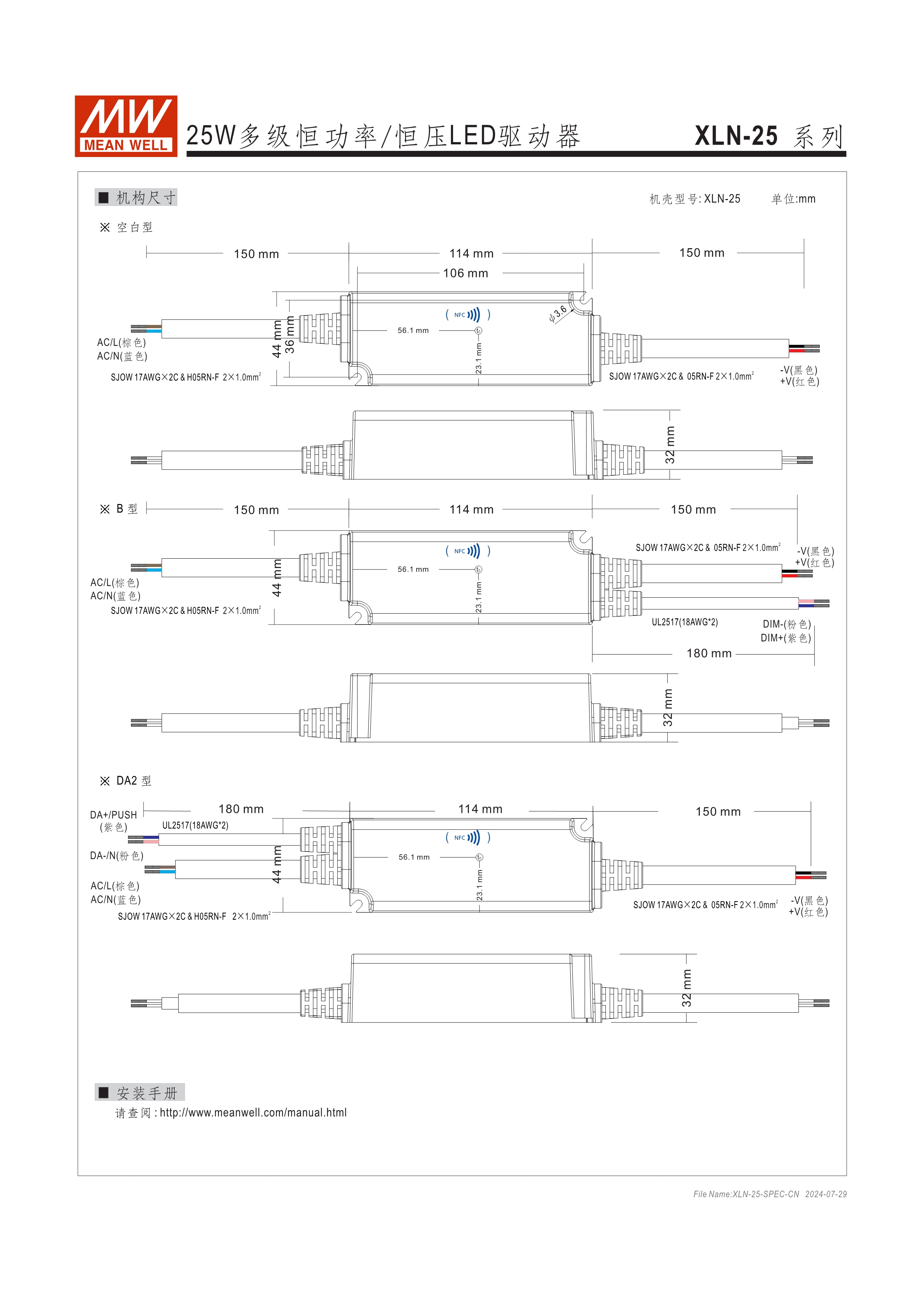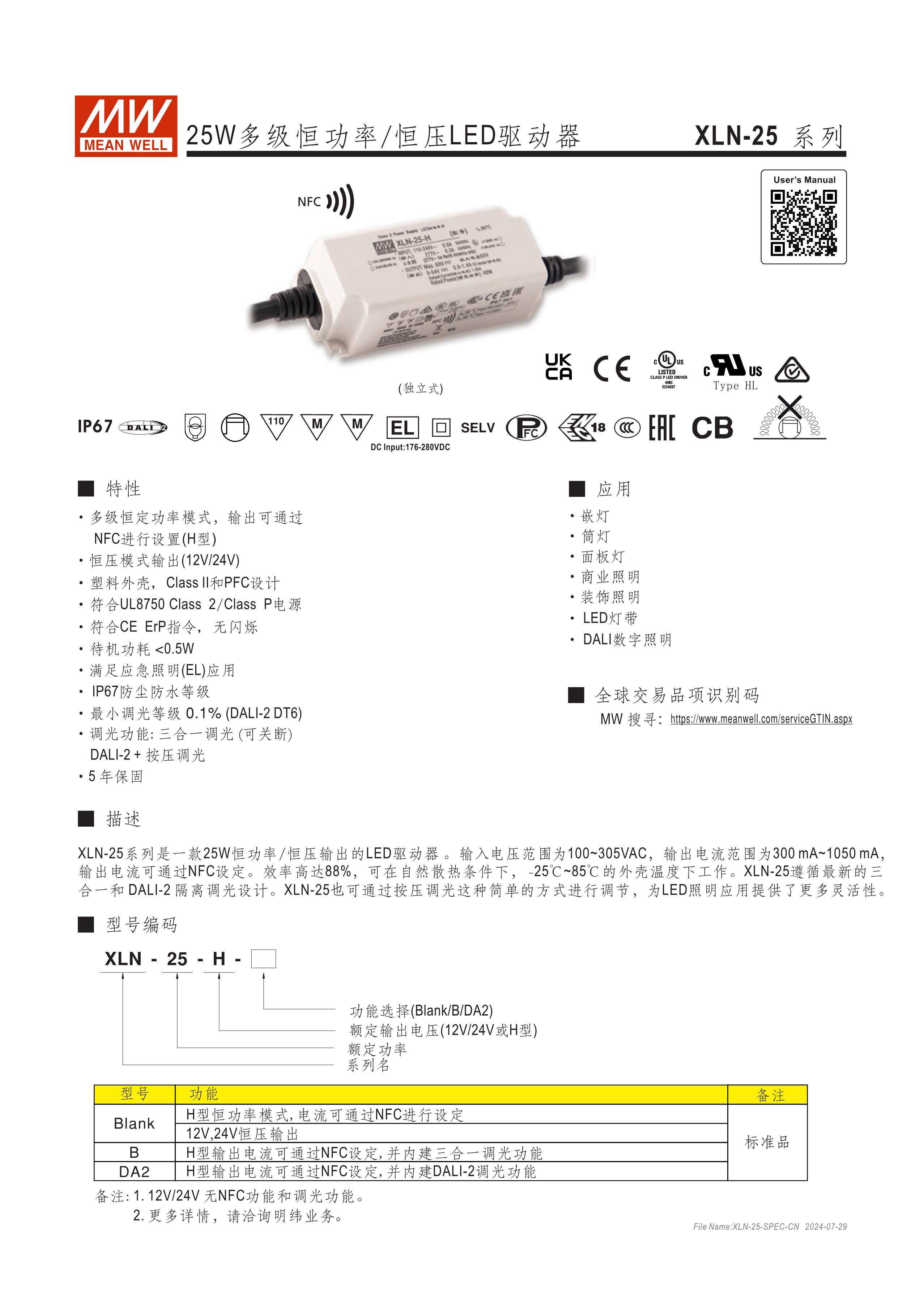 恒功率設(shè)計(jì)可寬范圍調(diào)整輸出電流(H型) 恒壓輸出機(jī)型可選12V/24V/48V NFC感應(yīng)調(diào)整輸出電流(出線(xiàn)式) 全電壓輸入110~305V AC 具PFC功能 塑膠殼雙重絕緣及Class II/2設(shè)計(jì) 符合IEEE 1789及Erp無(wú)頻閃標(biāo)準(zhǔn) 待機(jī)功耗<0.5W 最低調(diào)光亮度<0.1% (DALI-2 DT6) 全灌封膠設(shè)計(jì)符合IP67防水防塵 符合應(yīng)急照明(EL)功能 調(diào)光功能:三合一、DALI-2:KNX、IoT(選配) 輸出與調(diào)光線(xiàn)路間符合隔離設(shè)計(jì) 獨(dú)立型或內(nèi)置型LED驅(qū)動(dòng)電源可選 5年保固及>50,000 hrs壽命