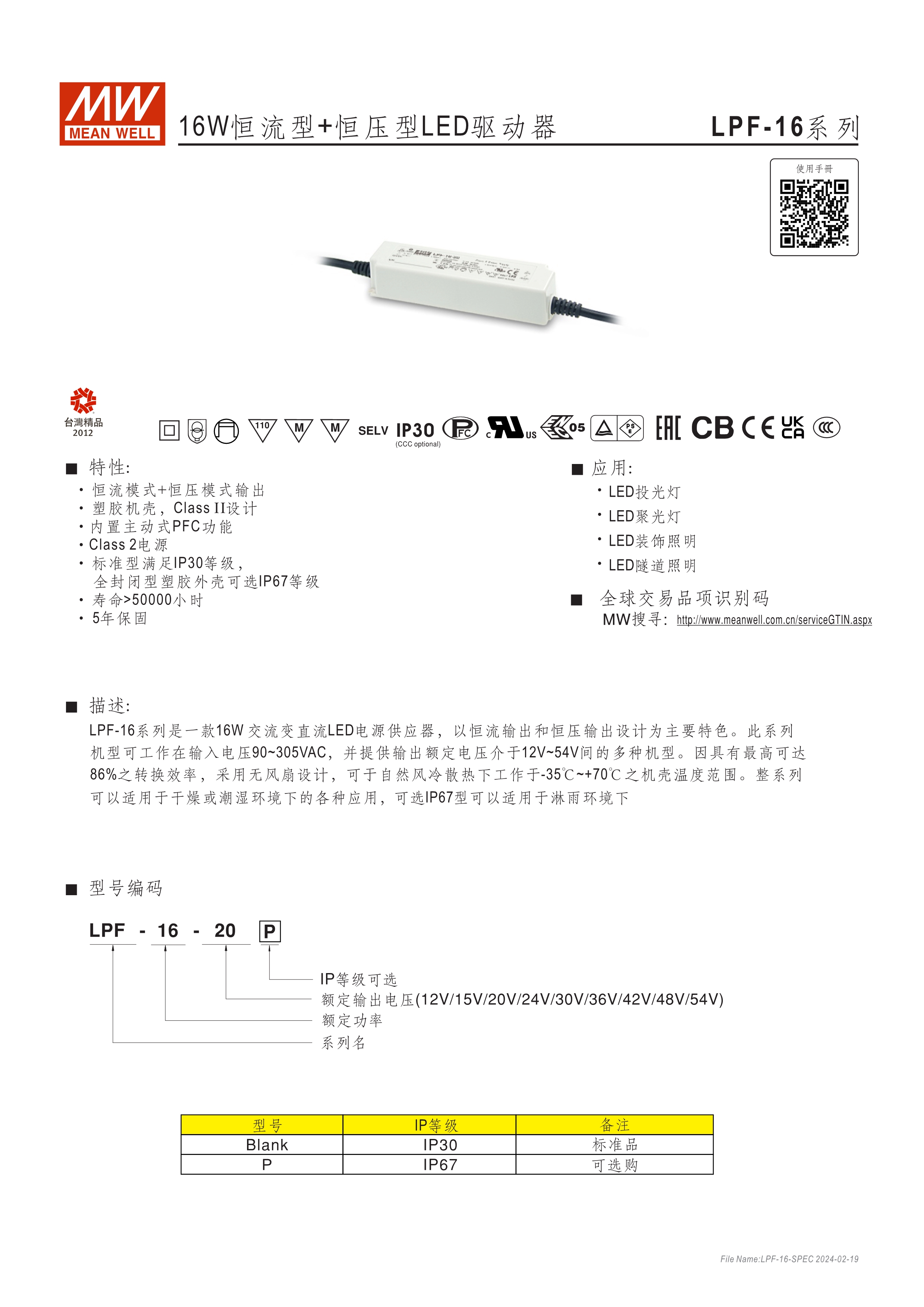 90~305VAC交流輸入, 內(nèi)建主動(dòng)式功率因子矯正功能(active PFC) 塑料外殼,IP67防護(hù)等級(jí)(16W需選購) Class II設(shè)計(jì),無FG D type 機(jī)種內(nèi)建三合一調(diào)光功能(1~10VDC,PWM信號(hào)或電阻) Type "HL" LED電源適用在安裝于Class I, Division 2 類 危險(xiǎn)地點(diǎn)之照明燈具(LPF-90/90D) 適合于LED照明及LED電子廣告牌相關(guān)應(yīng)用 5年保固期