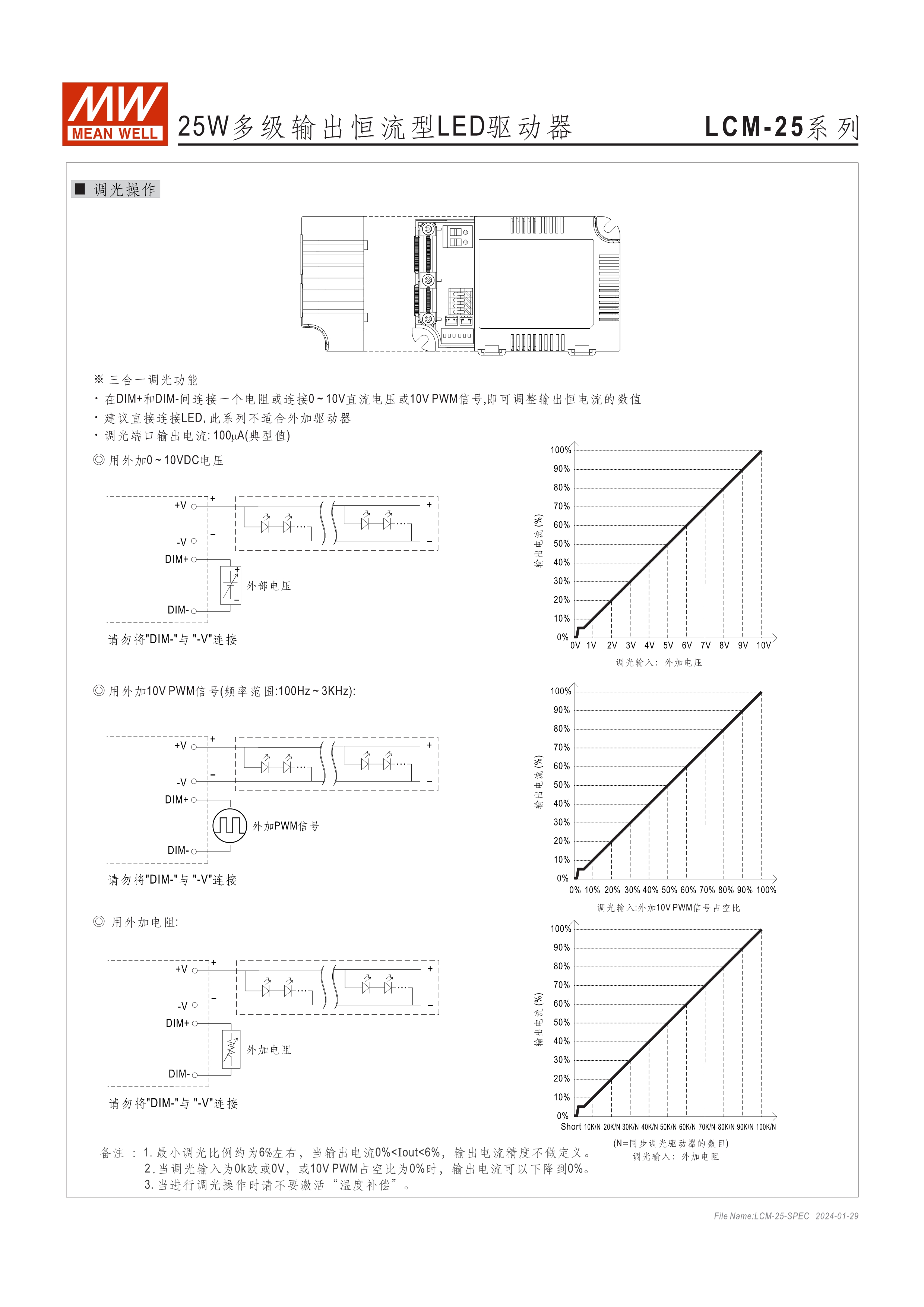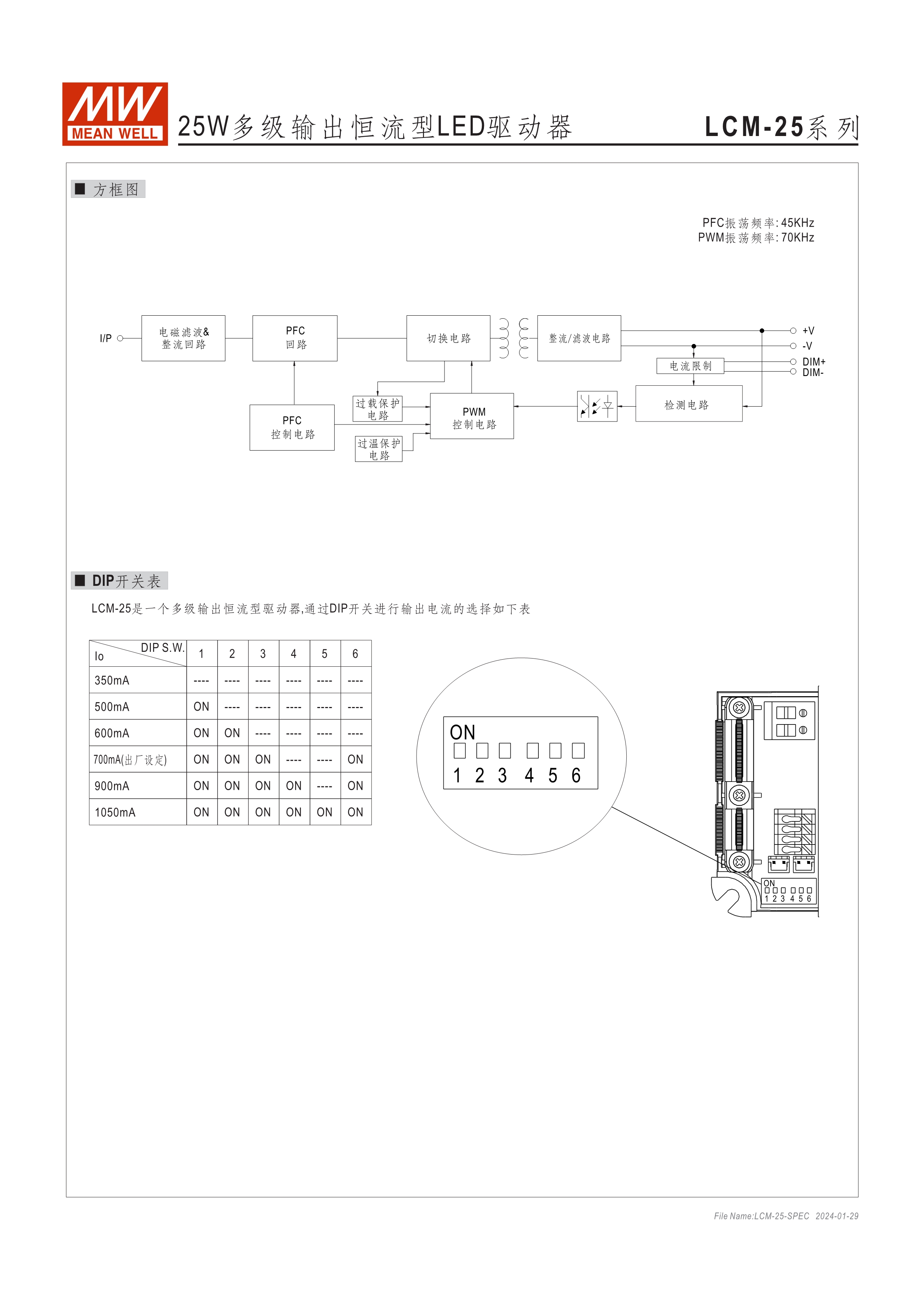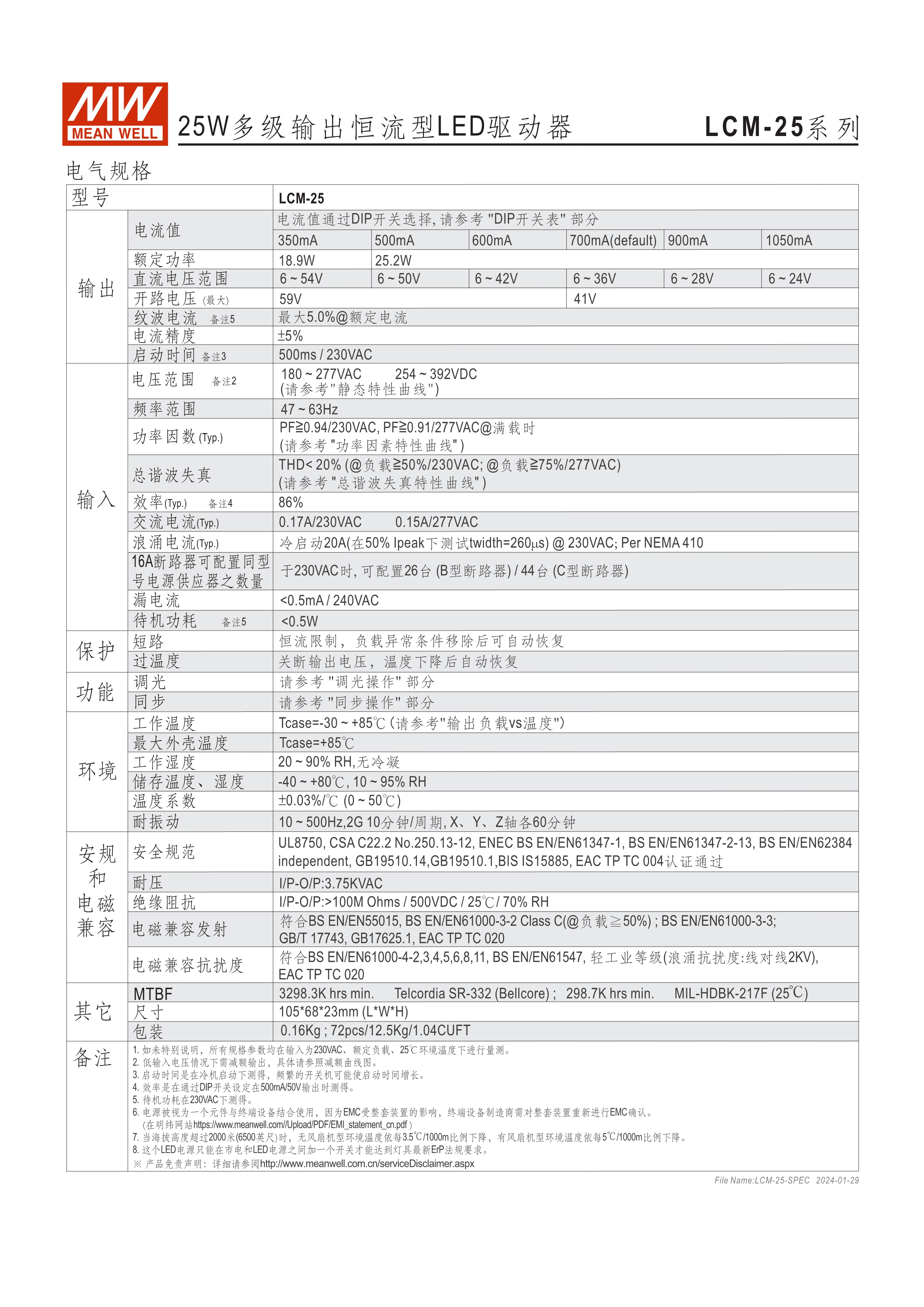 LCM-25(DA):180~277VAC交流輸入, LCM-40(DA)/60(DA):180~295VAC交流輸入 內(nèi)建主動(dòng)式功率因子矯正功能(active PFC) 塑料外殼 可透過指撥開關(guān)切換不同輸出電流檔位之多段式電源 LCM-25/40/60內(nèi)建三合一調(diào)光功能(0~10VDC, PWM信號(hào)或電阻,可關(guān)斷) LCM-25DA/40DA/60DA內(nèi)建DALI接口 和按鈕調(diào)光功能(Push Dim) LCM-40TW為2路輸出支持可溫(DT8)及調(diào)光(DT6)應(yīng)用 適合于LED室內(nèi)照明相關(guān)應(yīng)用