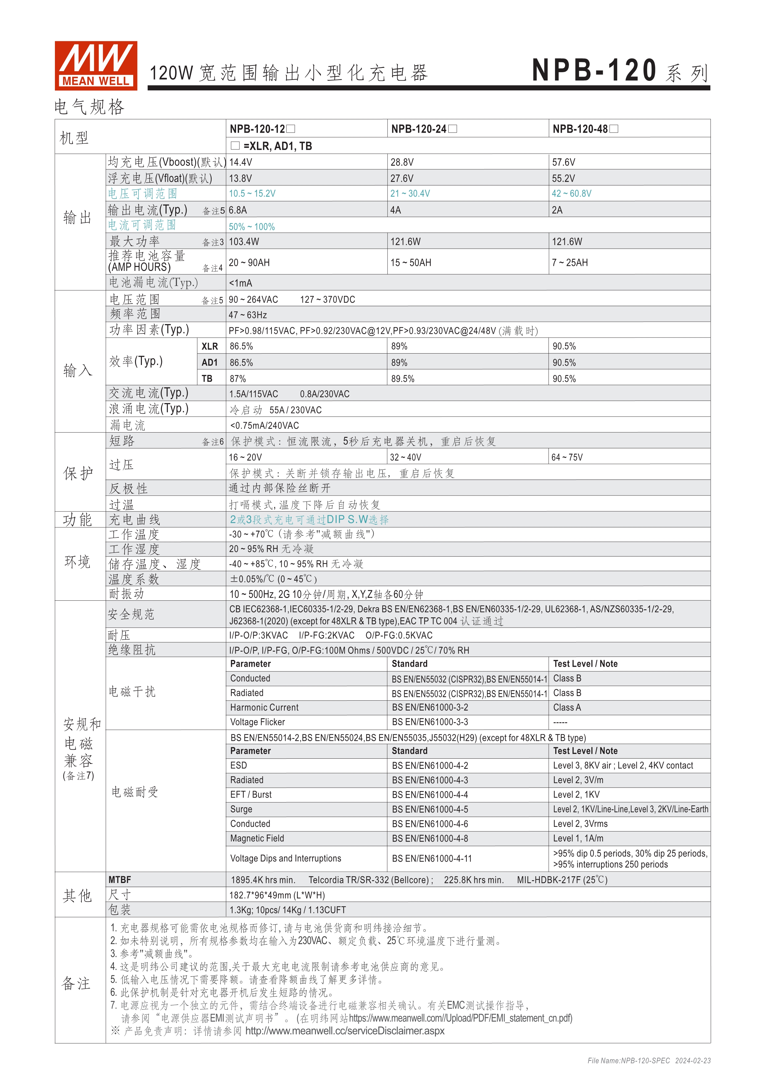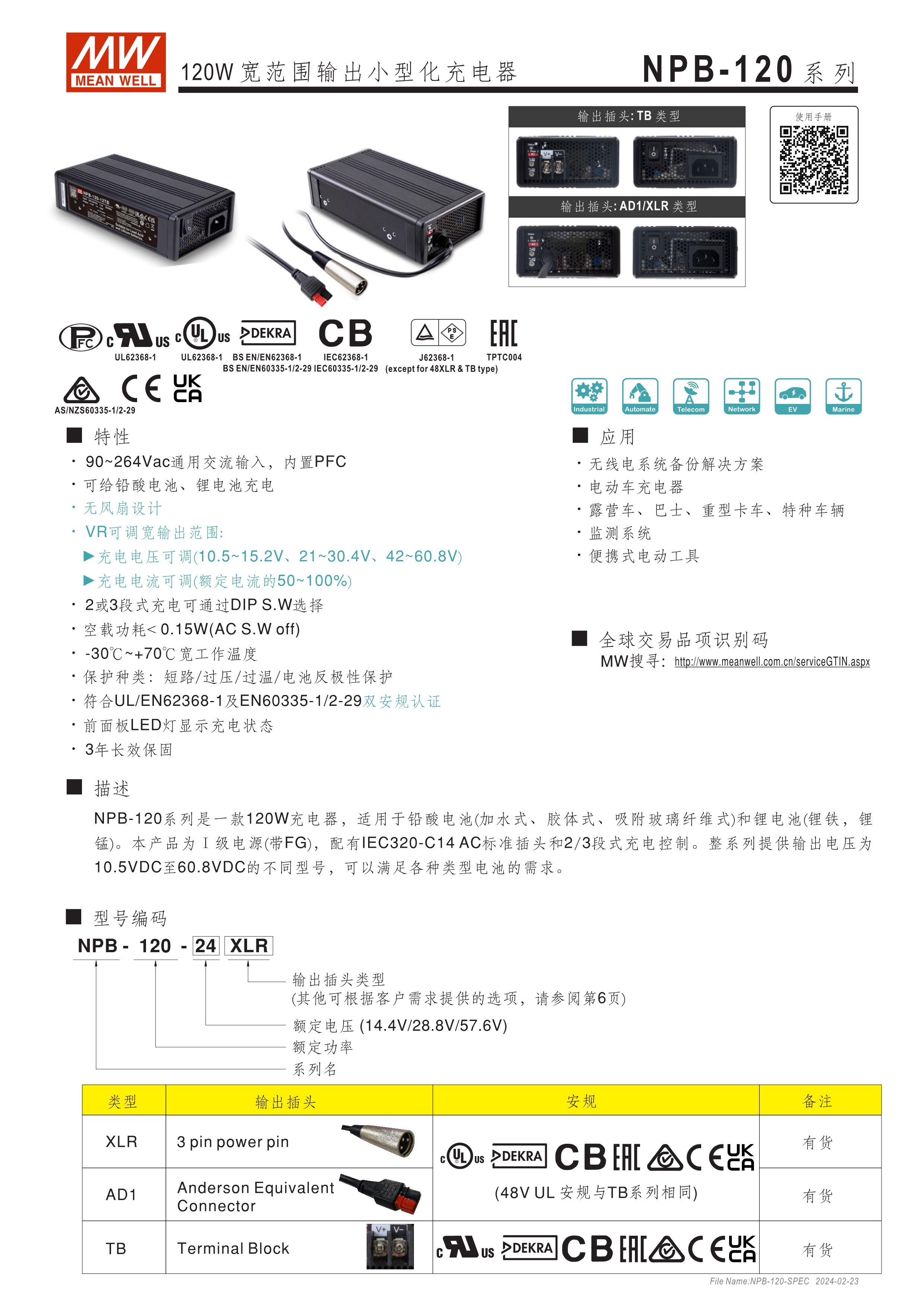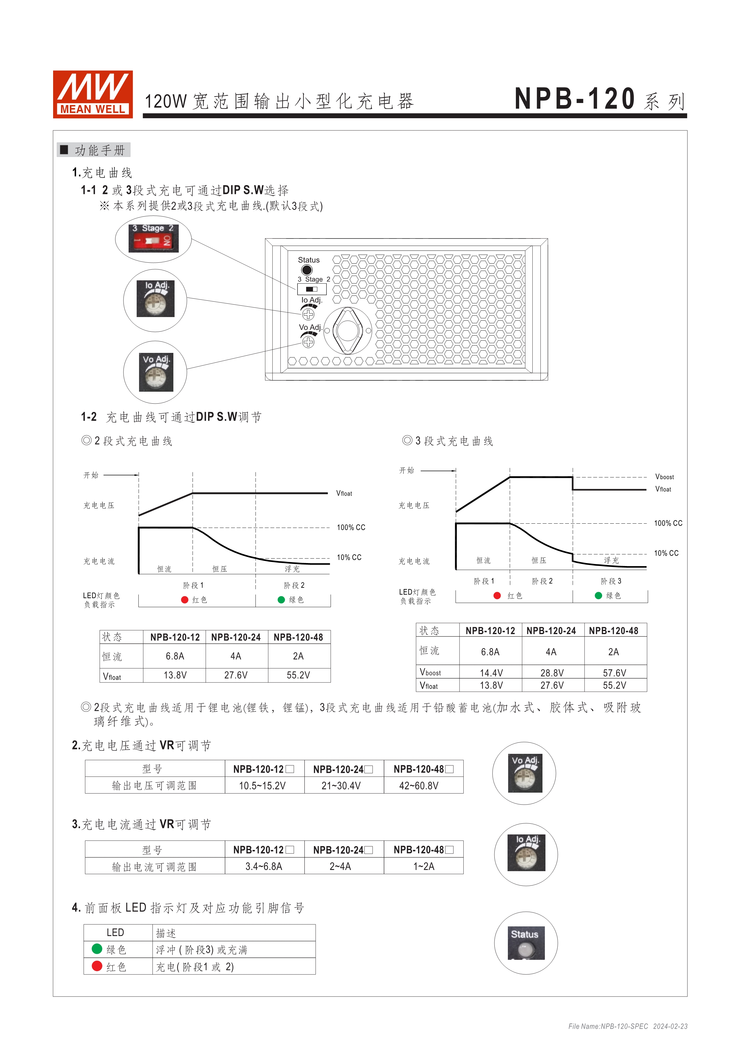 基礎(chǔ)型可靠耐用寬壓充電器 金屬殼散熱快、使用不燙手 可調(diào)功能簡便、使用彈性高: ? 可調(diào)充電電壓 (由面板調(diào)整10.5~15.2V, 21~30.4V, 42~60V) ? 可調(diào)充電電流 (由面板VR調(diào)整50~100%) ? 透過面板DIP Switch可選2段或3段充電 保護功能:短路、過壓、過溫度、電池反極性保護 通過UL/EN62368-1及IEC60335-1/2-29雙安規(guī)認(rèn)證 DC輸出接頭多樣可選:Anderson、麥克風(fēng)頭、端子臺 3年保固
