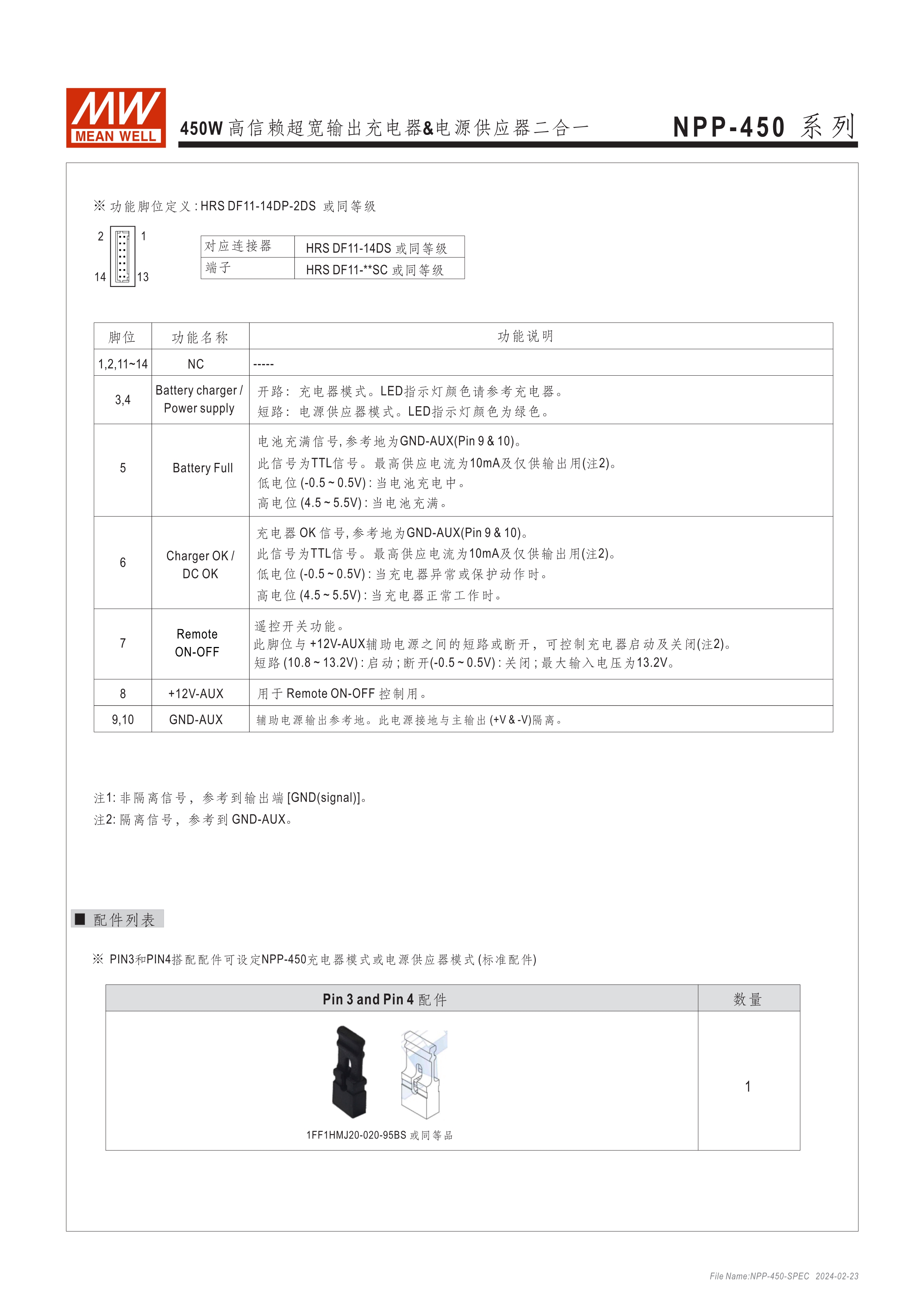 可彈性切換充電器或電源供應(yīng)器 3段式充電,僅適用鉛酸電池 可調(diào)輸出電壓 [由面板VR可調(diào)整10.5~21V, 21~42V, 42~80V, 54~100V(僅NPB-450)] 可調(diào)輸出電流 (由面板VR調(diào)整50~100%) -30~+70oC寬溫度,使用環(huán)境受限少 保護(hù)功能:短路、過壓、過溫度 可另購(gòu)手提把手 (Order No.: Carry Handle) 通過UL/EN62368-1、IEC/EN62368-1/-2-29雙安規(guī)認(rèn)證 3年保固