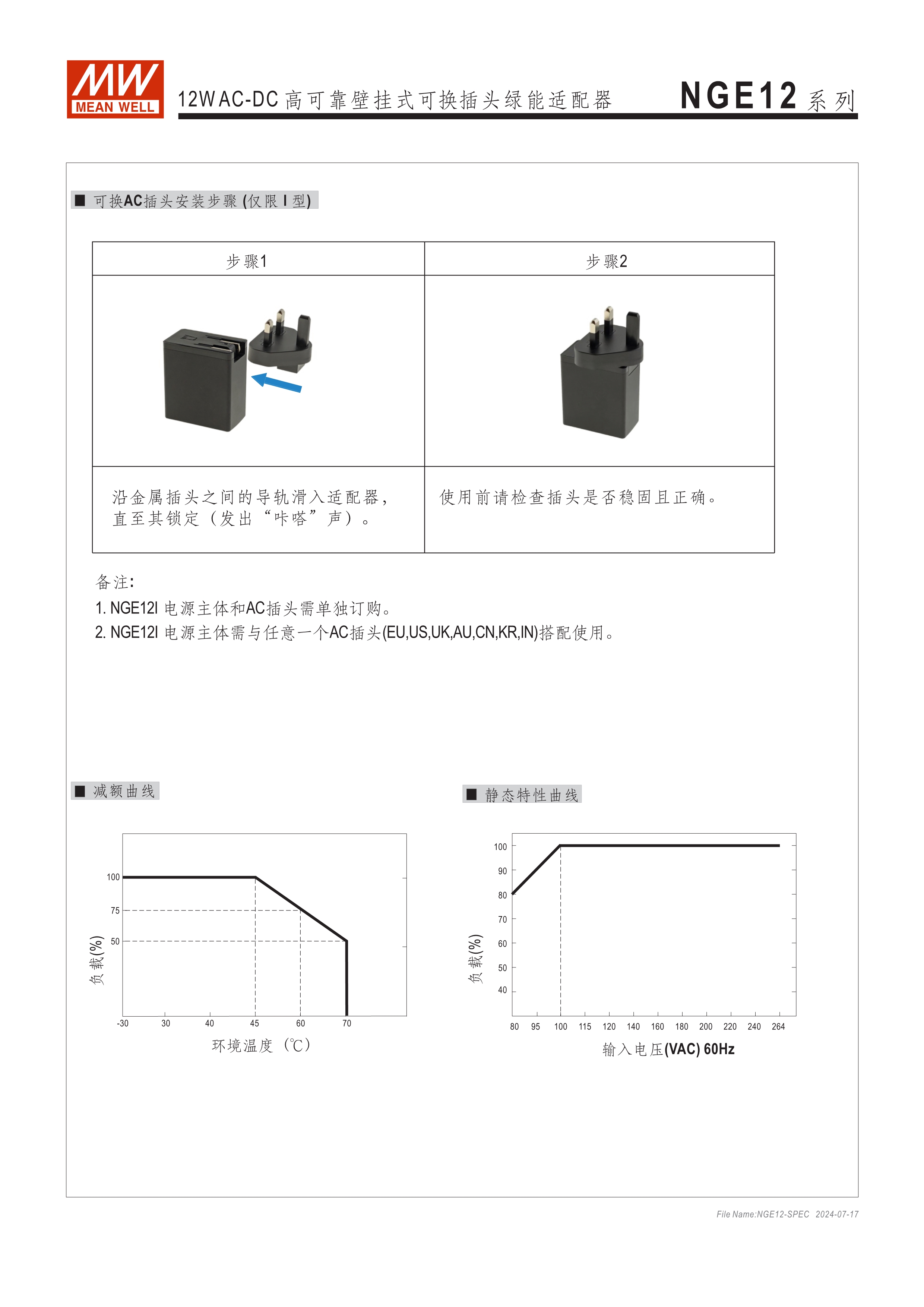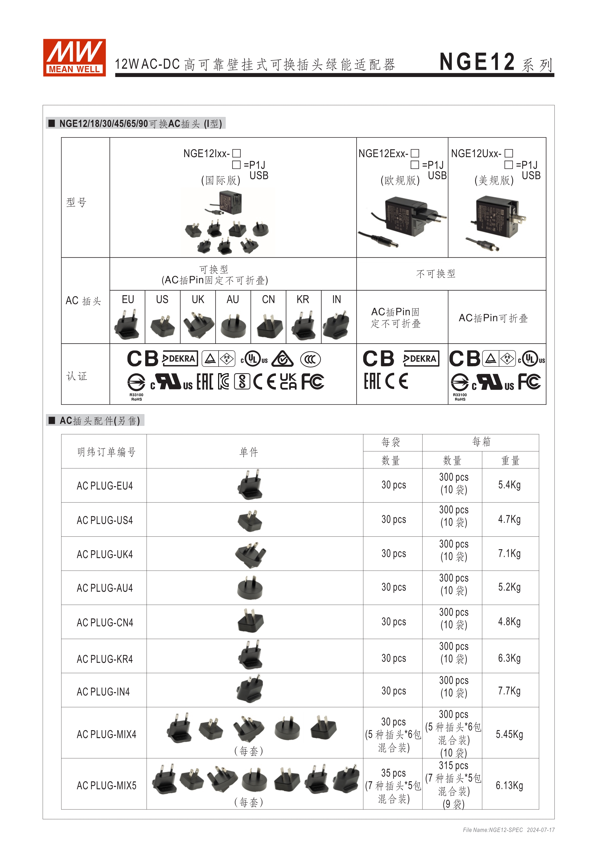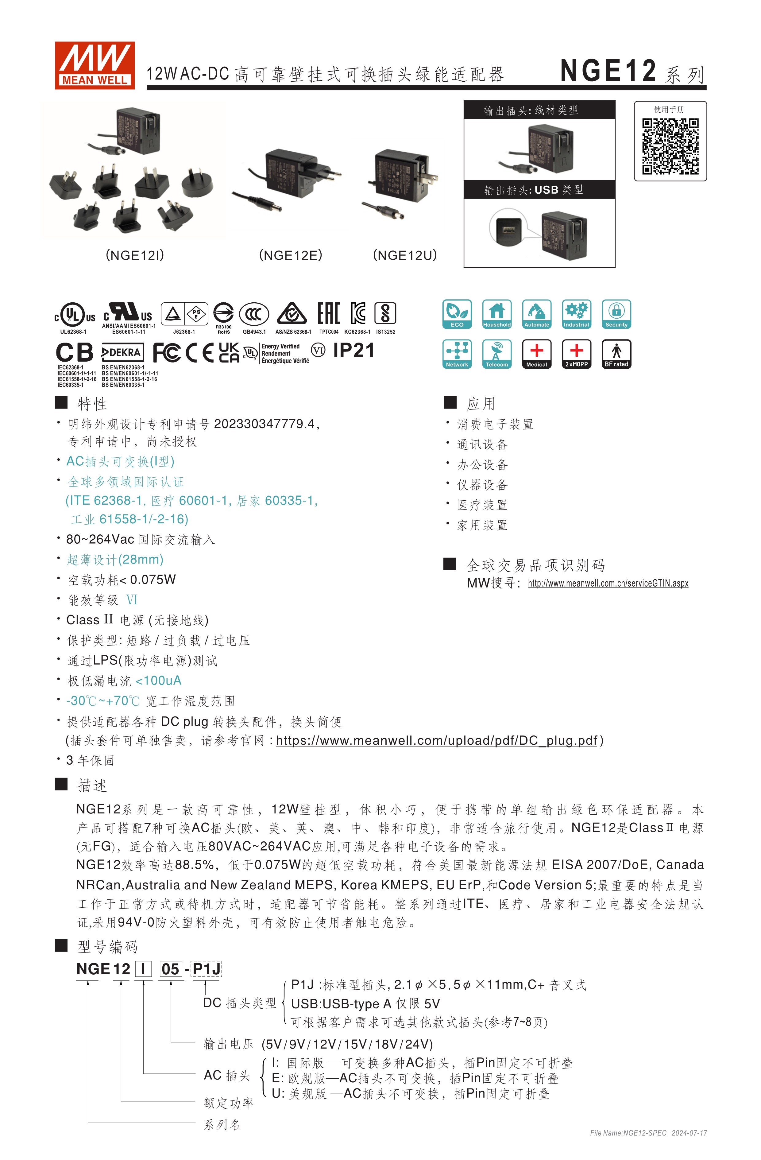 可換AC插頭 符合多領(lǐng)域全球認證 (信息類 62368-1、醫(yī)療 60601-1, 家用 60335-1、工業(yè) 61558-1/-2-16) 全范圍AC輸入 2xMOPP, BF應(yīng)用 超窄面寬設(shè)計(28mm~30mm) 漏電流 <100uA 80~264V輸入 空載損耗<0.075W~0.1W 能效等級Level VII 保護功能:短路、過載、過電壓 漏電流 <100uA -30~70℃寬工作溫度 多種DC輸出轉(zhuǎn)接頭可更換 3年保固期