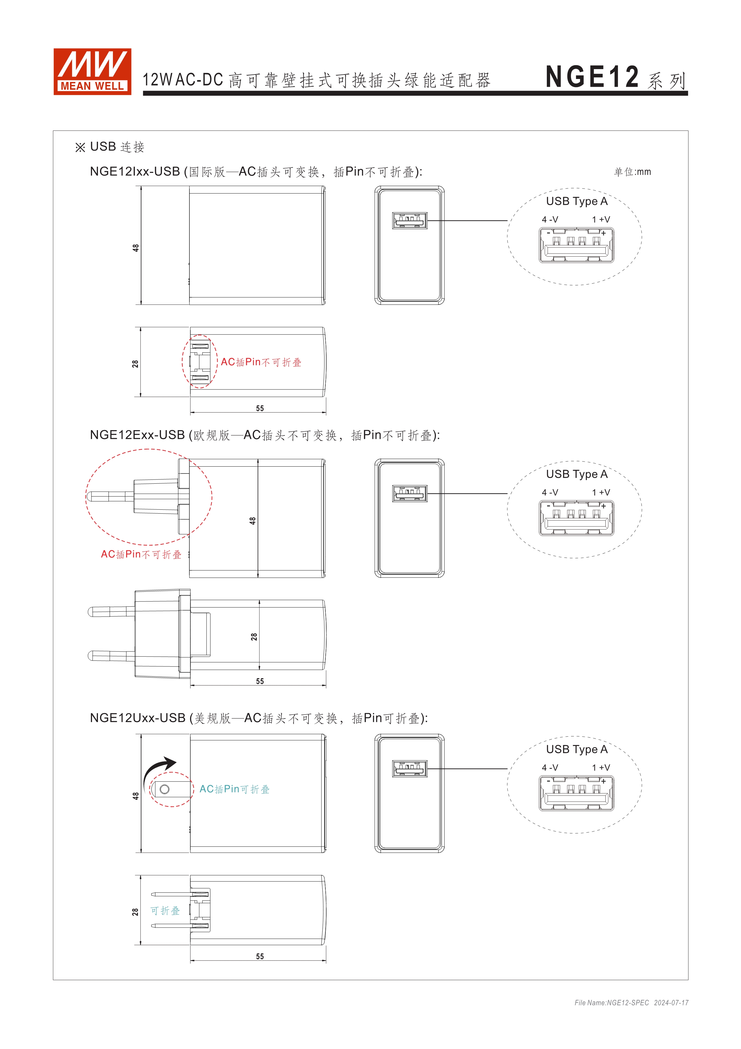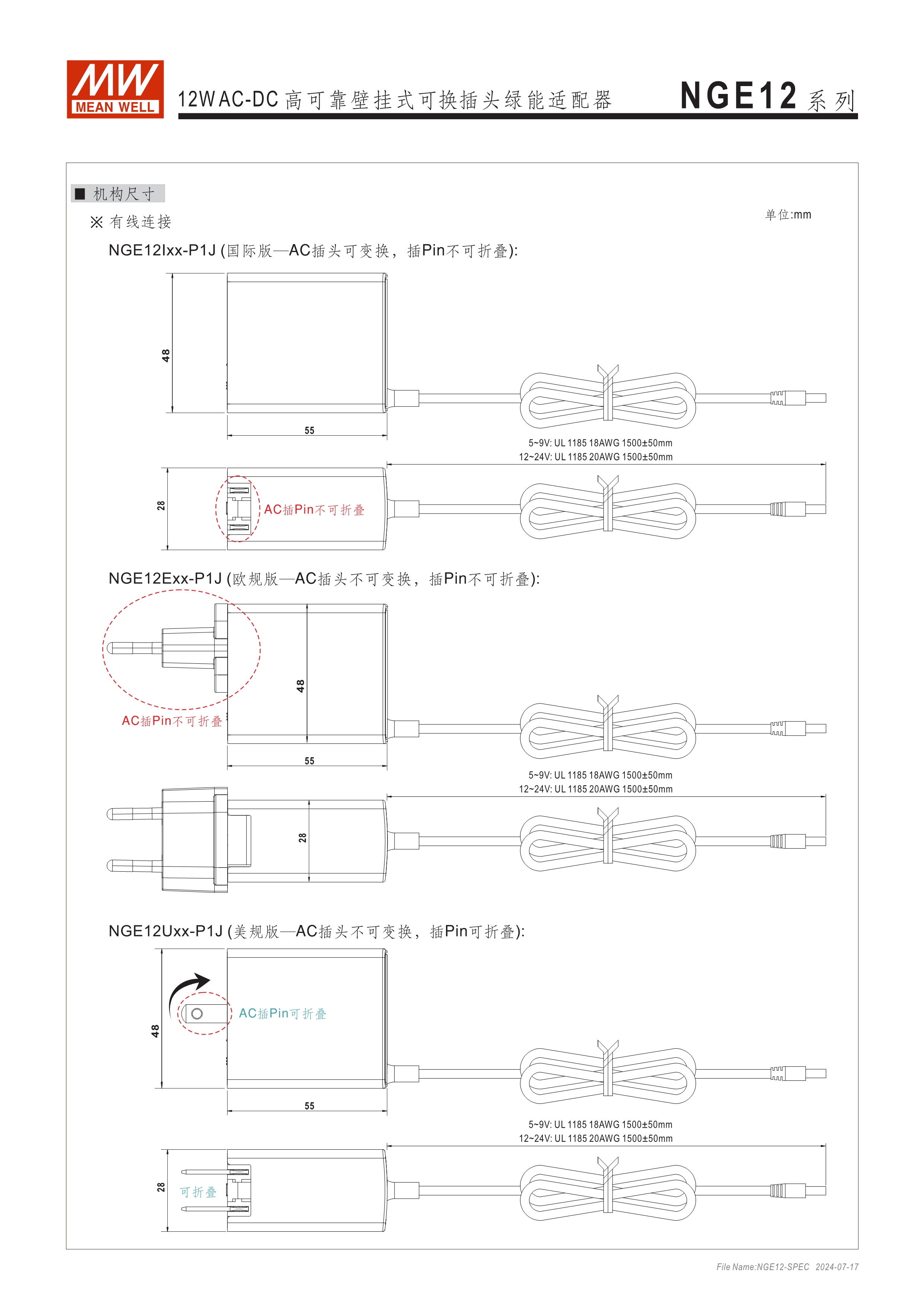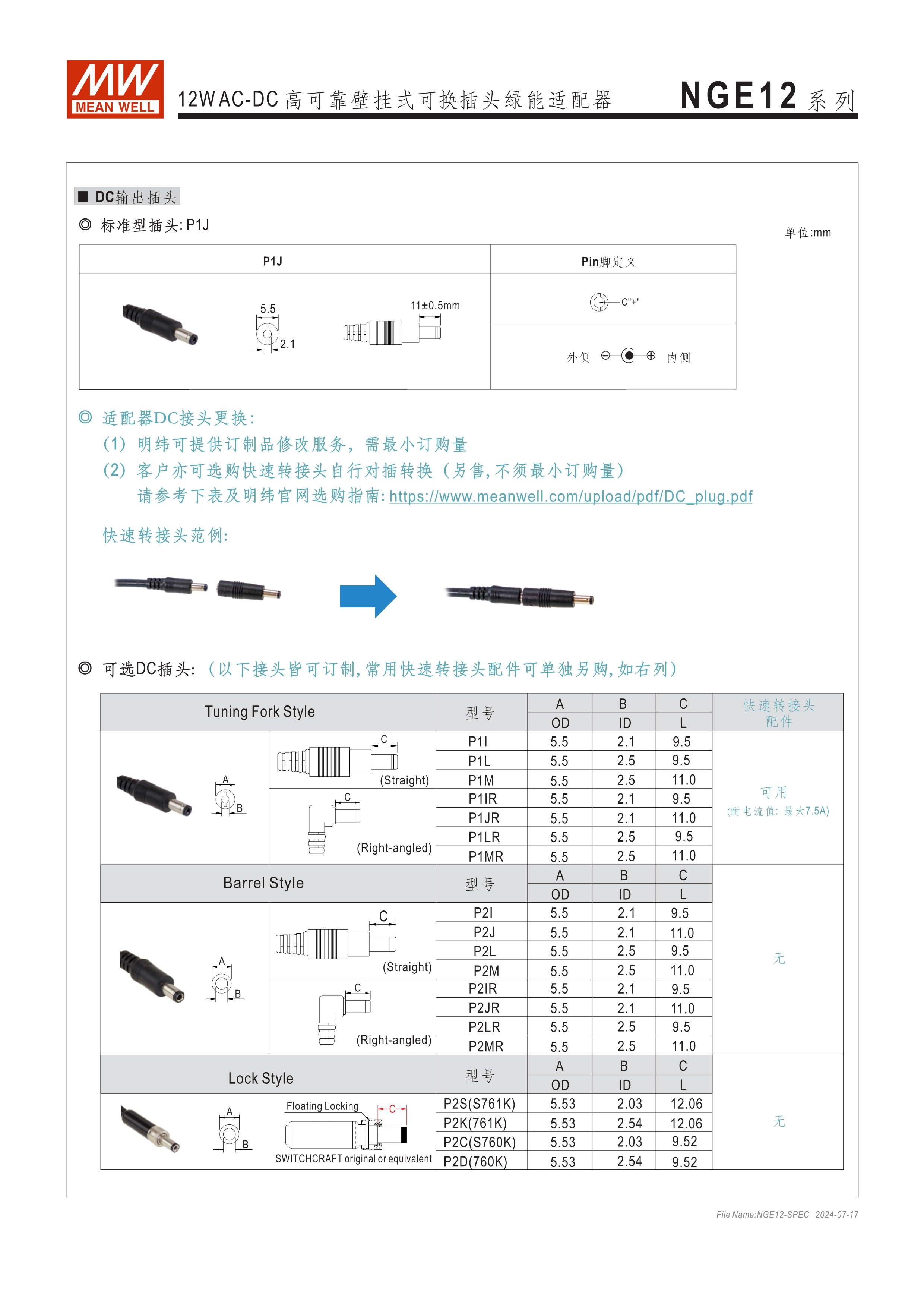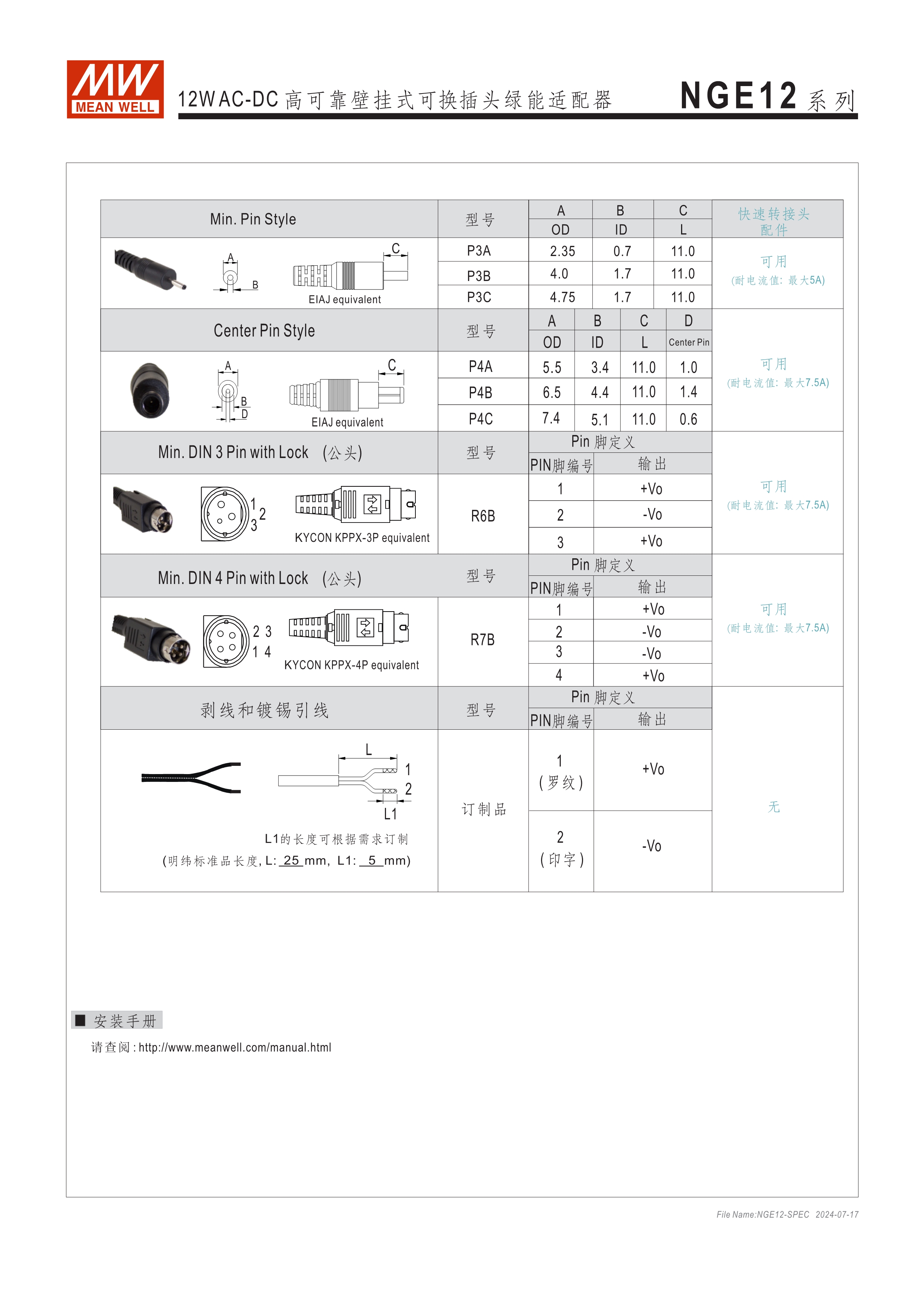 可換AC插頭 符合多領(lǐng)域全球認證 (信息類 62368-1、醫(yī)療 60601-1, 家用 60335-1、工業(yè) 61558-1/-2-16) 全范圍AC輸入 2xMOPP, BF應(yīng)用 超窄面寬設(shè)計(28mm~30mm) 漏電流 <100uA 80~264V輸入 空載損耗<0.075W~0.1W 能效等級Level VII 保護功能:短路、過載、過電壓 漏電流 <100uA -30~70℃寬工作溫度 多種DC輸出轉(zhuǎn)接頭可更換 3年保固期
