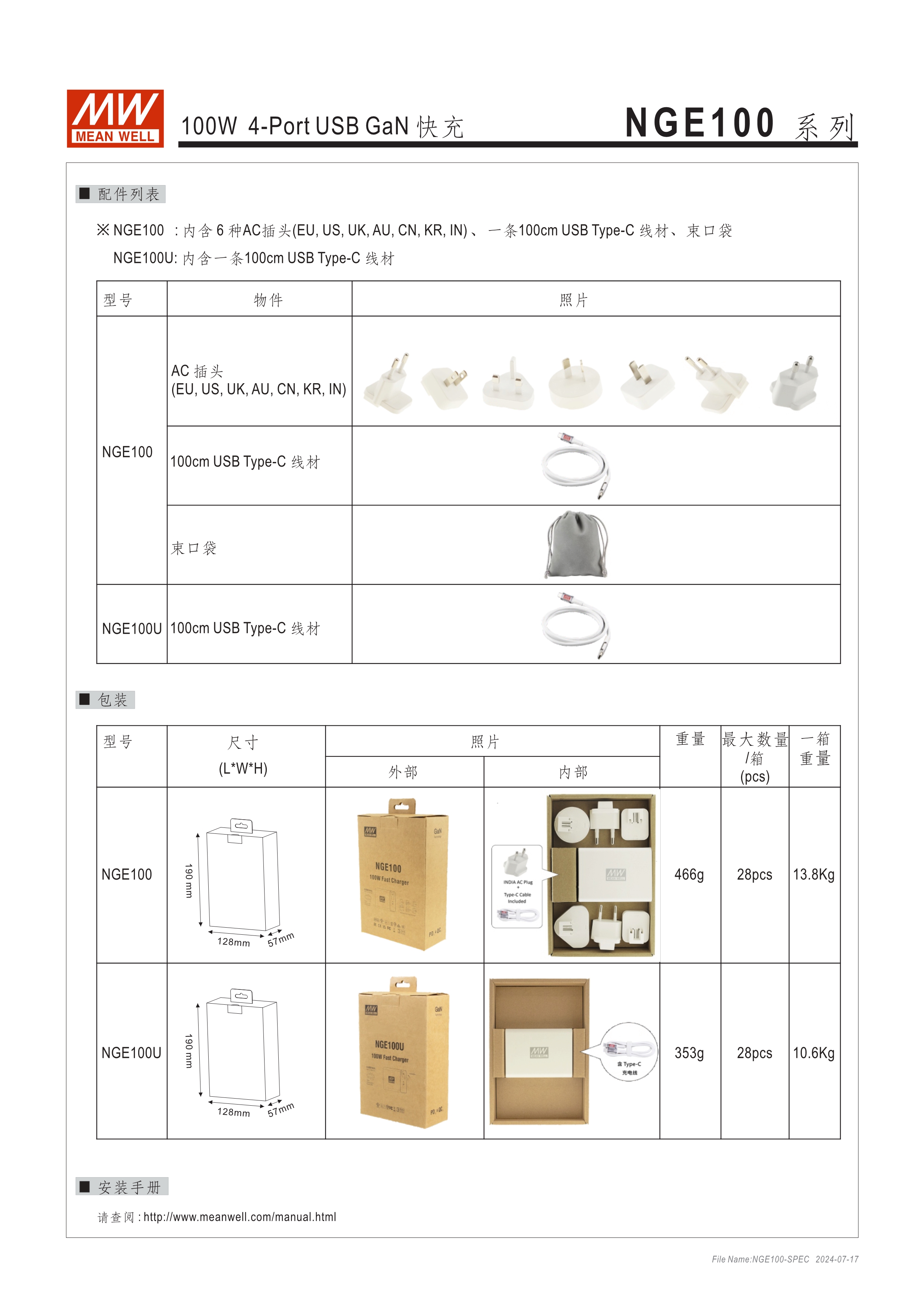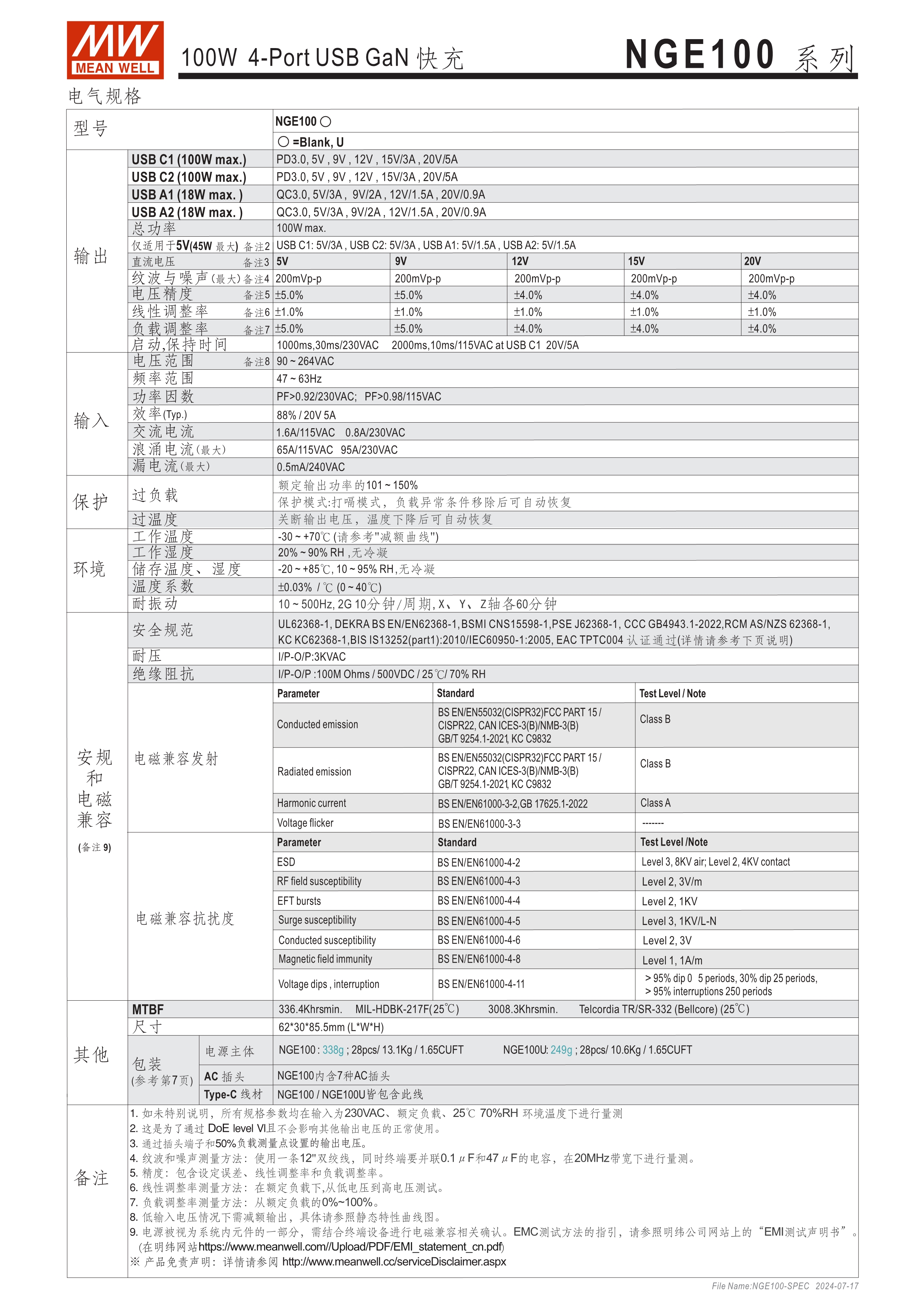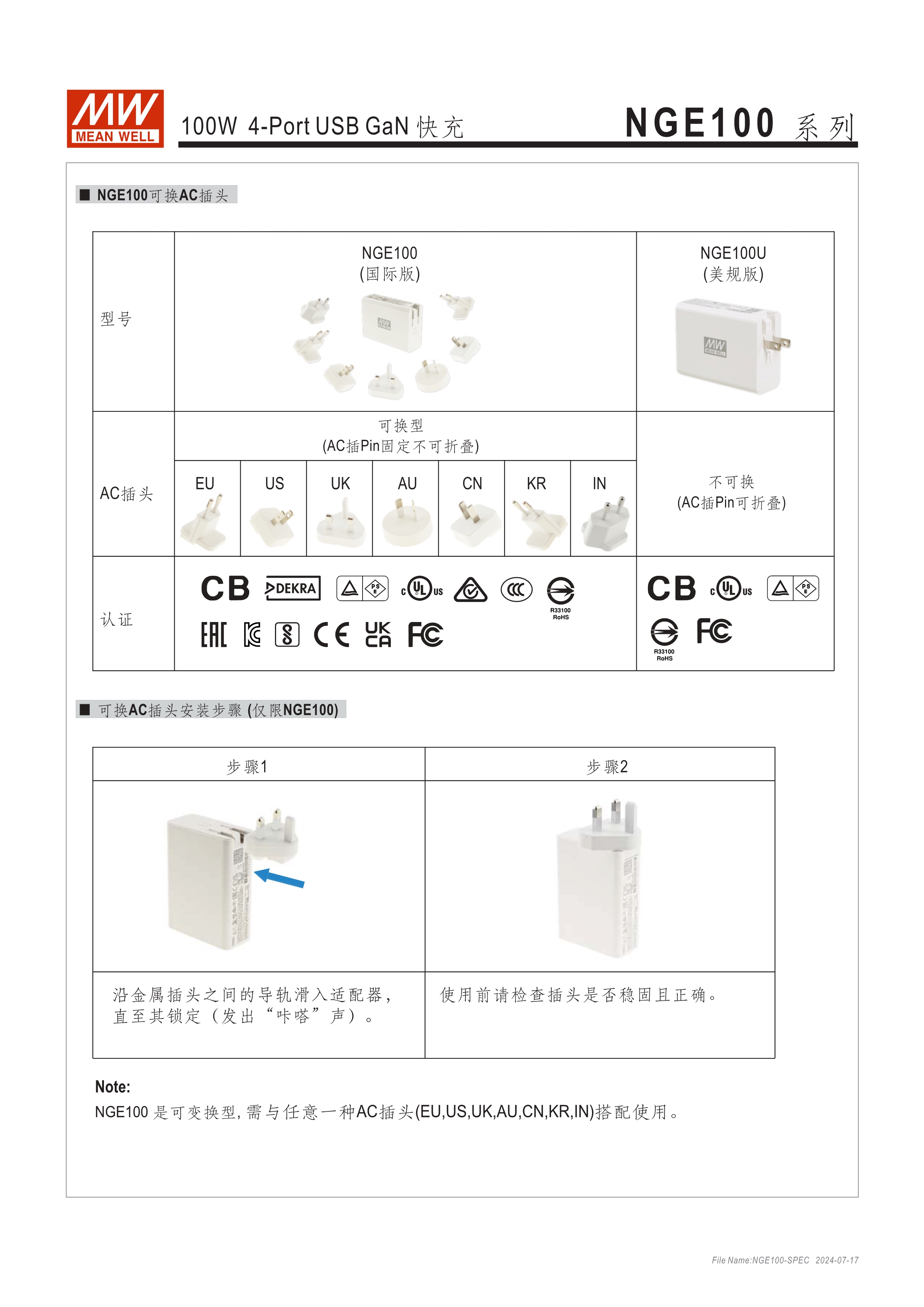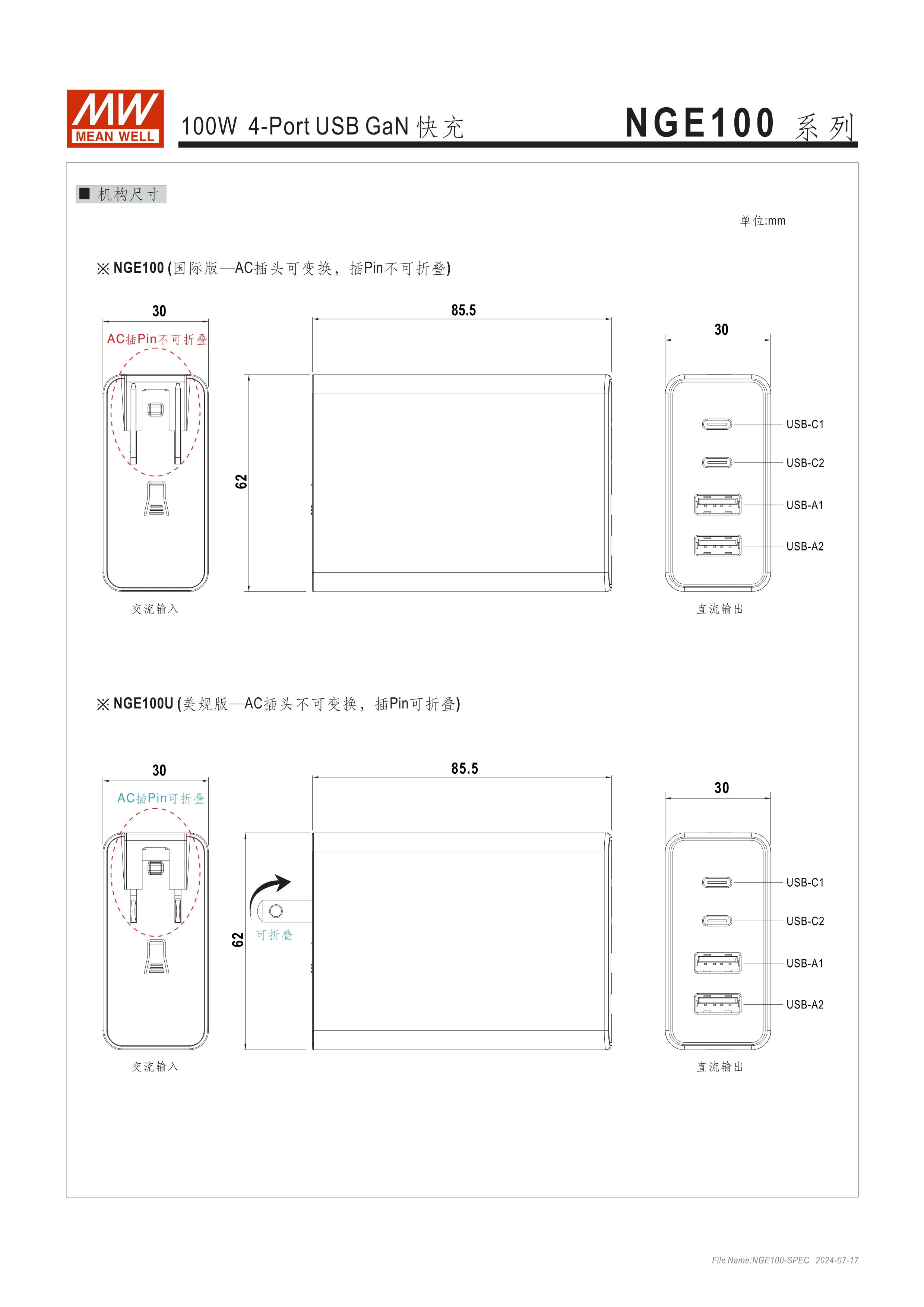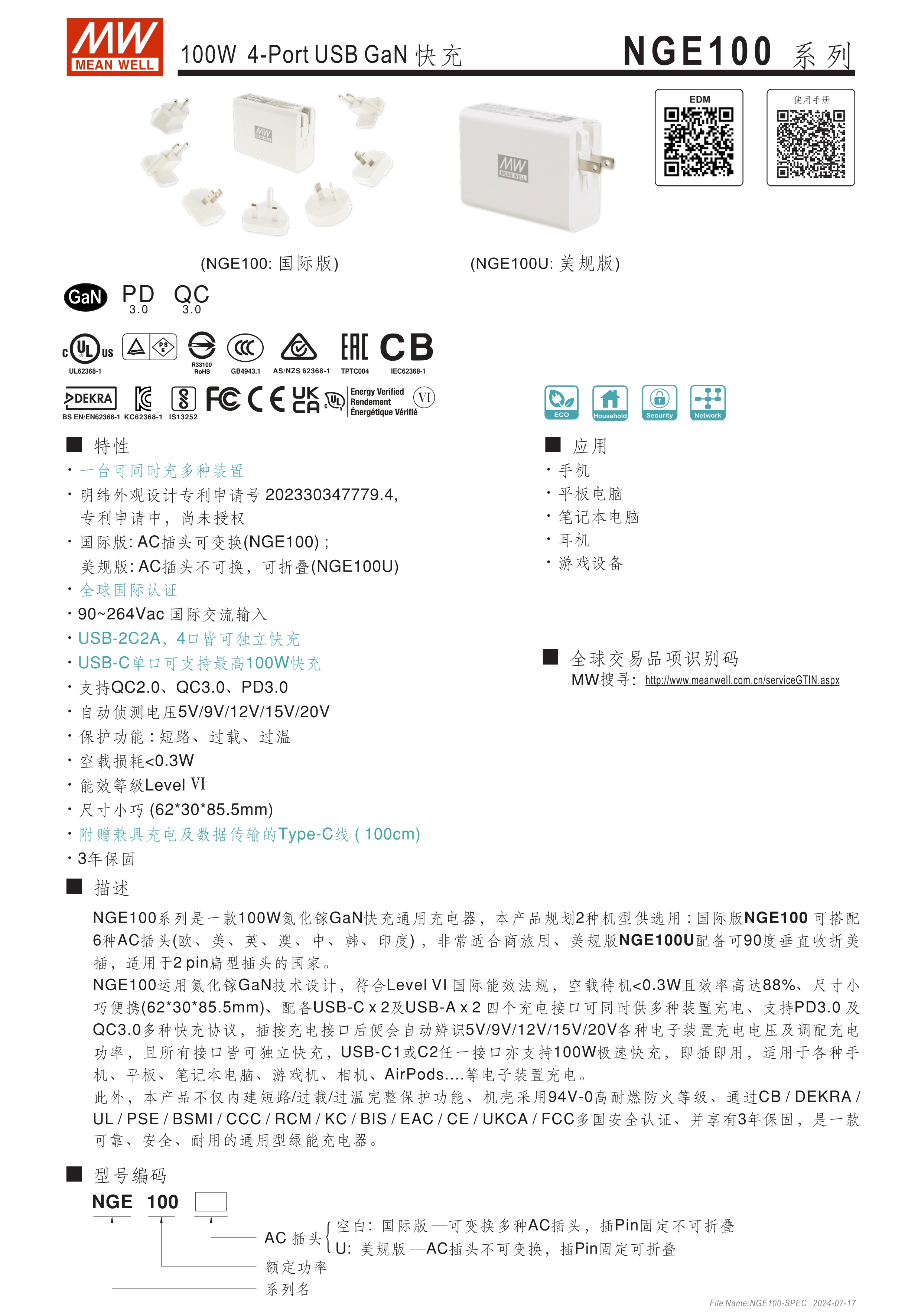 一臺可同時充多種裝置 國際版: AC插頭可變換(NGE100); 美規(guī)版: AC插頭不可換,可折疊(NGE100U) 全球國際認證 USB-2C2A,4-Port皆可獨立快充 USB-C單port可支援最高100W快充 支援QC2.0、QC3.0、PD3.0 自動偵測電壓:5V/ 9V/ 12V/ 15V/ 20V 保護功能 : 短路、過載、過溫 空載損耗<0.3W 能效等級Level VI 尺寸小巧 (62x 30x 85.5mm) 附贈兼具充電及資料傳輸?shù)腡ype-C線 (100cm) 3年保固