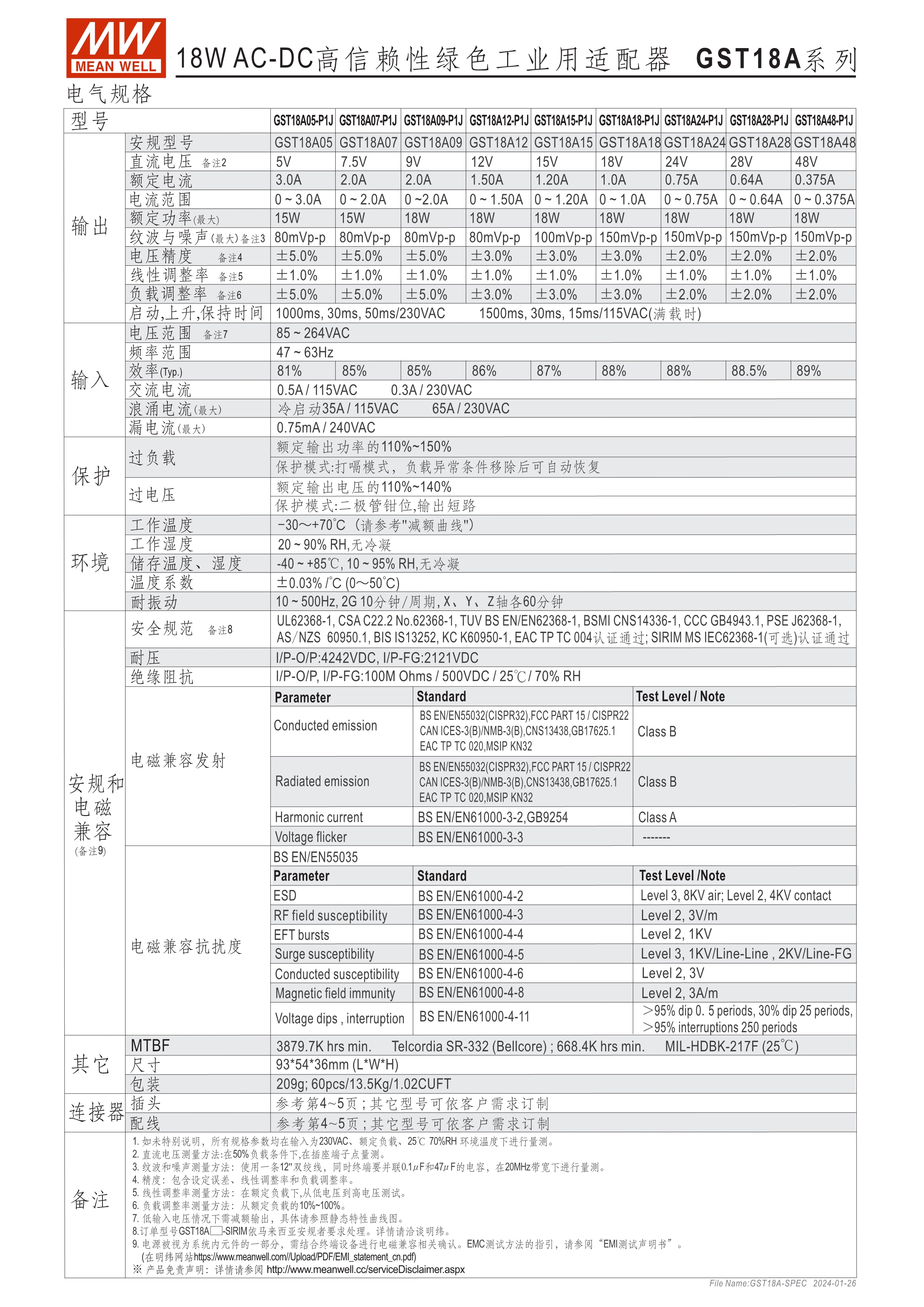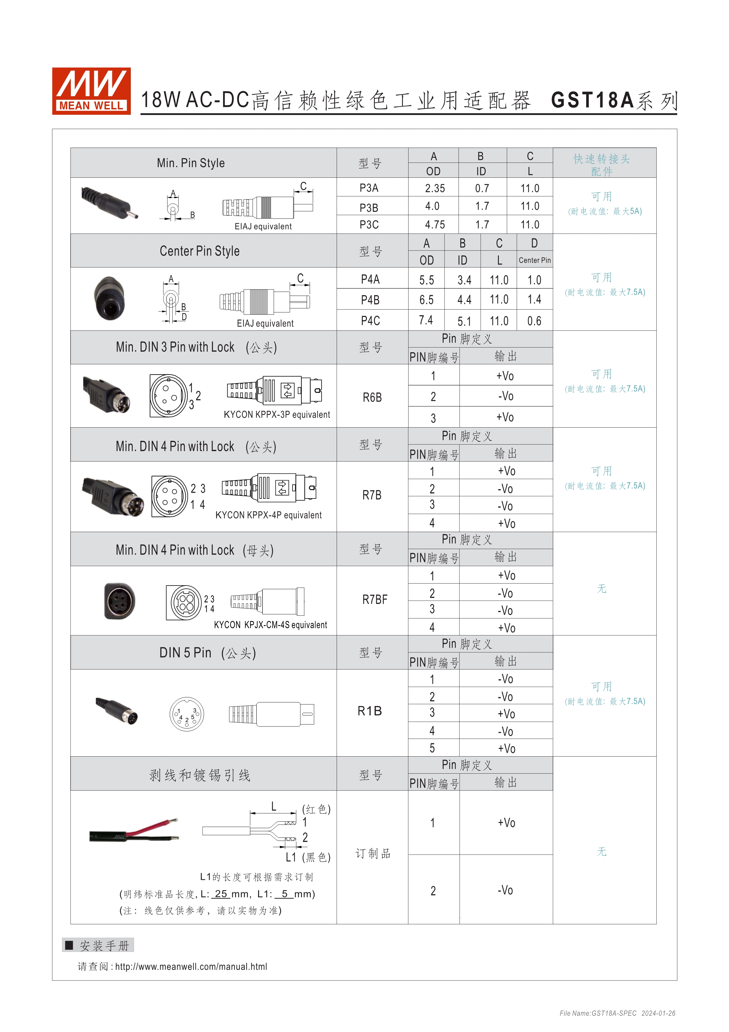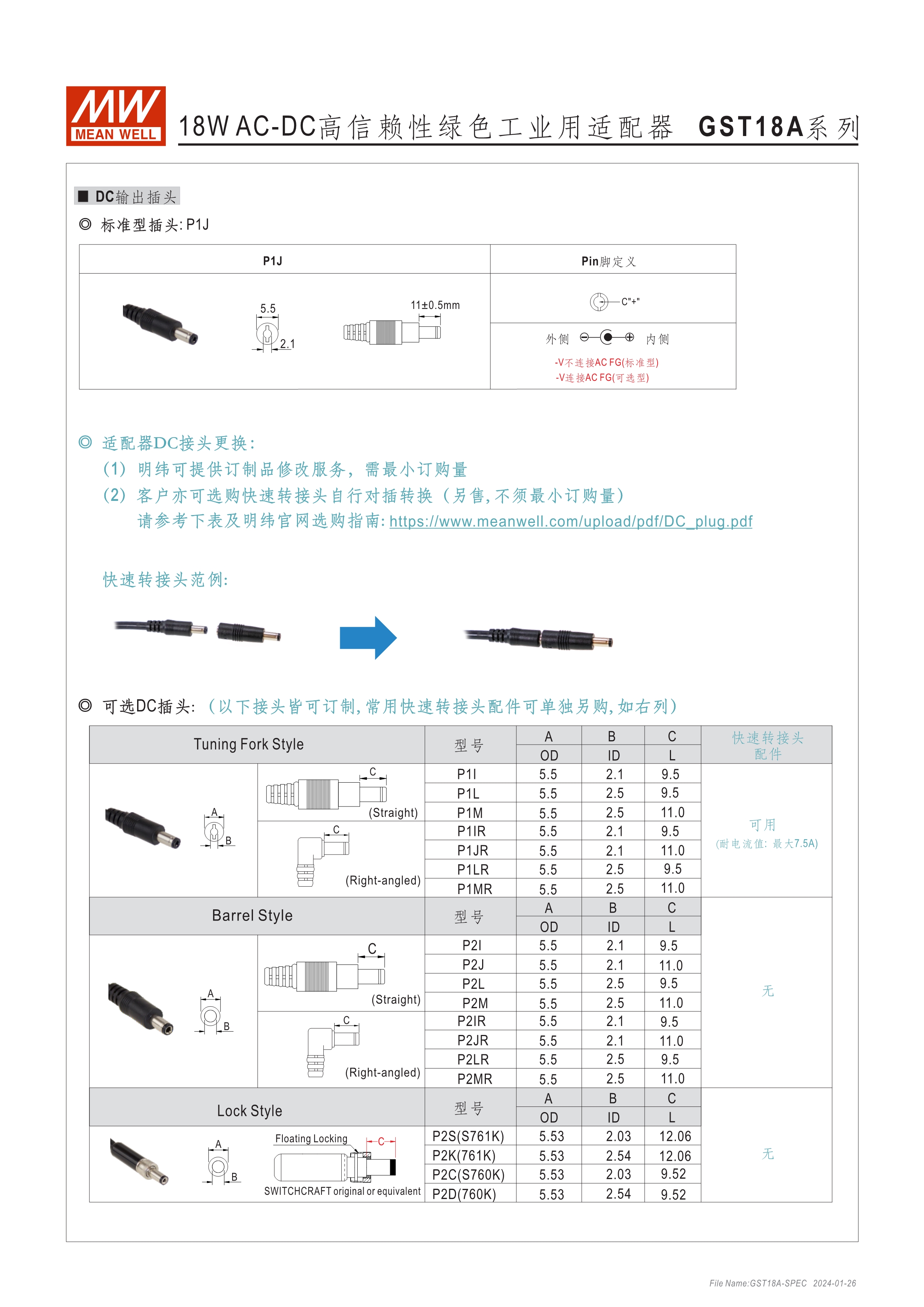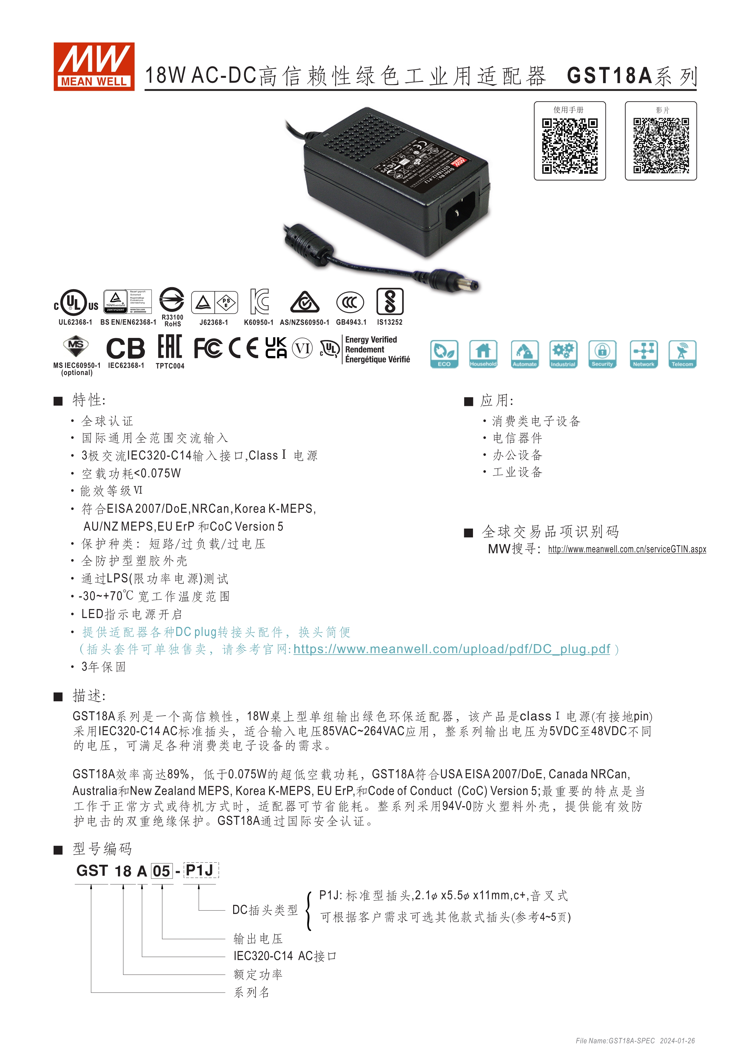 GST系列環(huán)球認(rèn)證 : UL, TUV, PSE, RCM, KC, SIRIM, BIS, EAC, BSMI, CCC 能效等級Level VI 空載損耗<0.075W~0.5W 無風(fēng)扇設(shè)計(jì),工作溫度:-30~70oC A型:Class I 電源(有接地PIN),IEC 320-C14接口; B型:Class II 電源(無接地PIN),IEC 320-C8接口 多種DC輸出轉(zhuǎn)接頭可更換 3年保固期