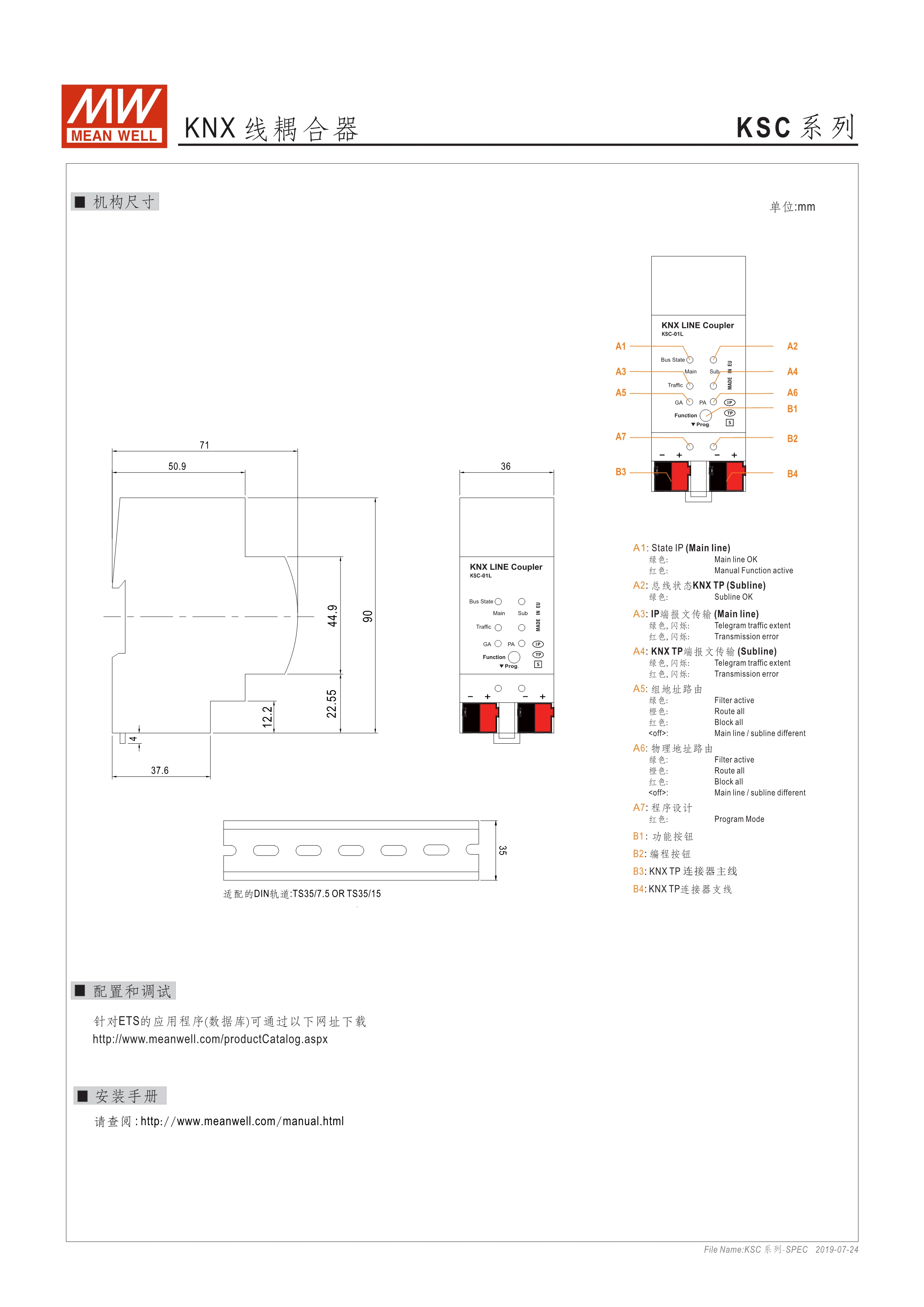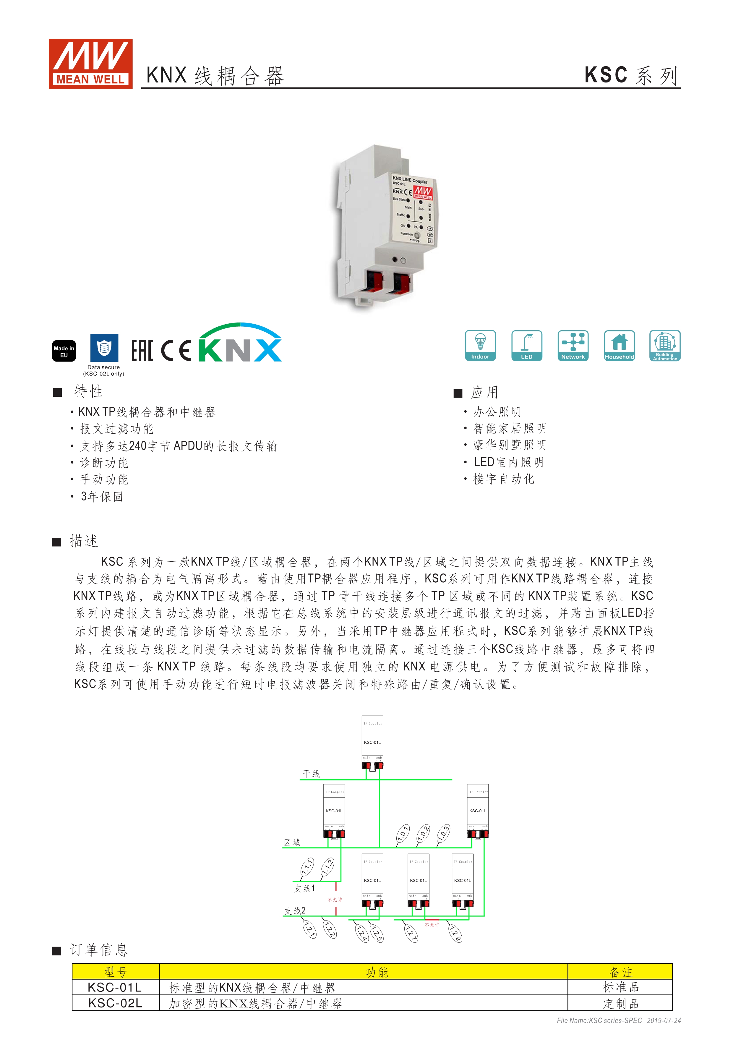 KNX TP線耦合器/中繼器 報文過濾功能 支持長訊息達(dá)240 byte APDU 追蹤子線路流量 診斷功能 手動操作功能 3年保固