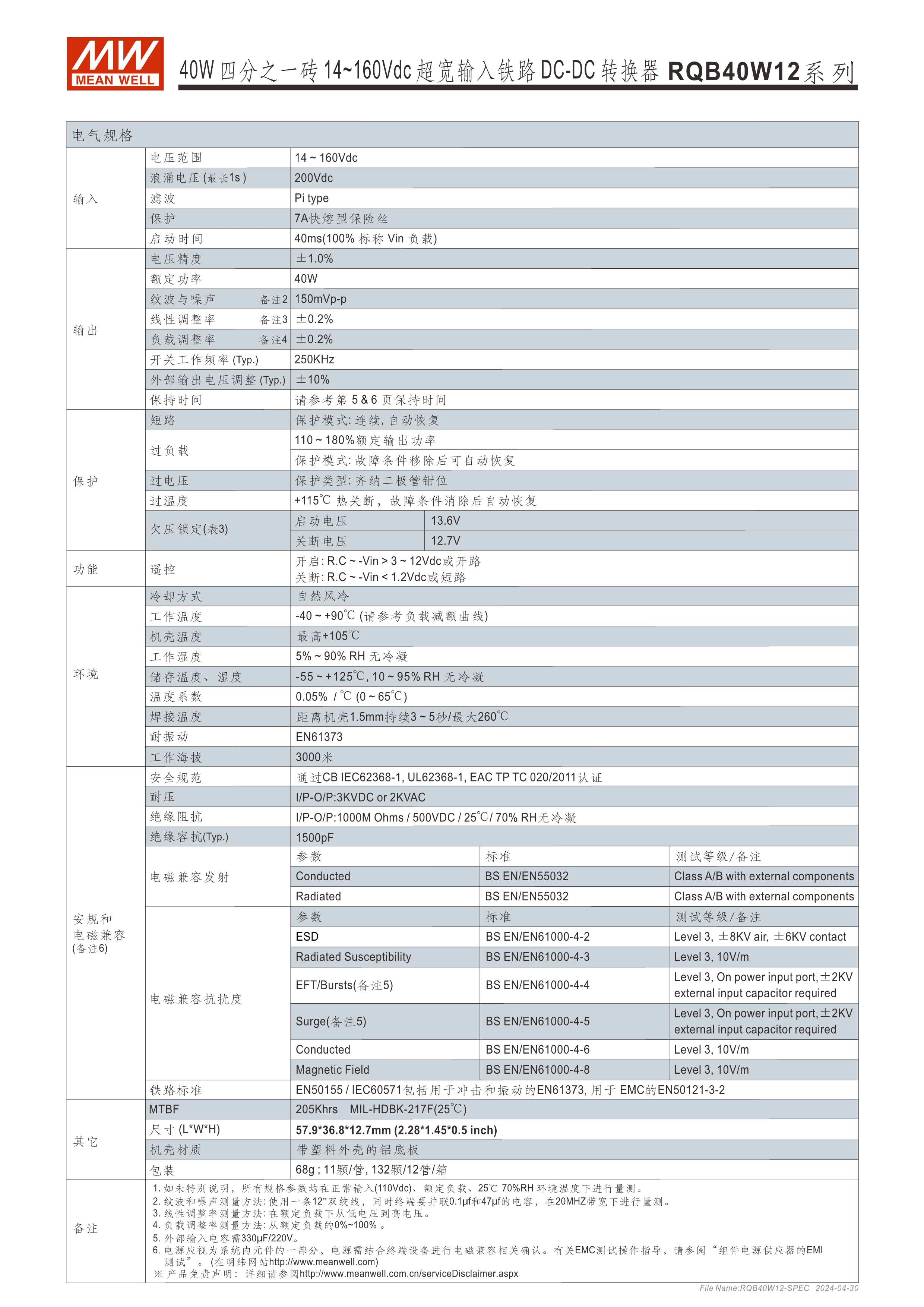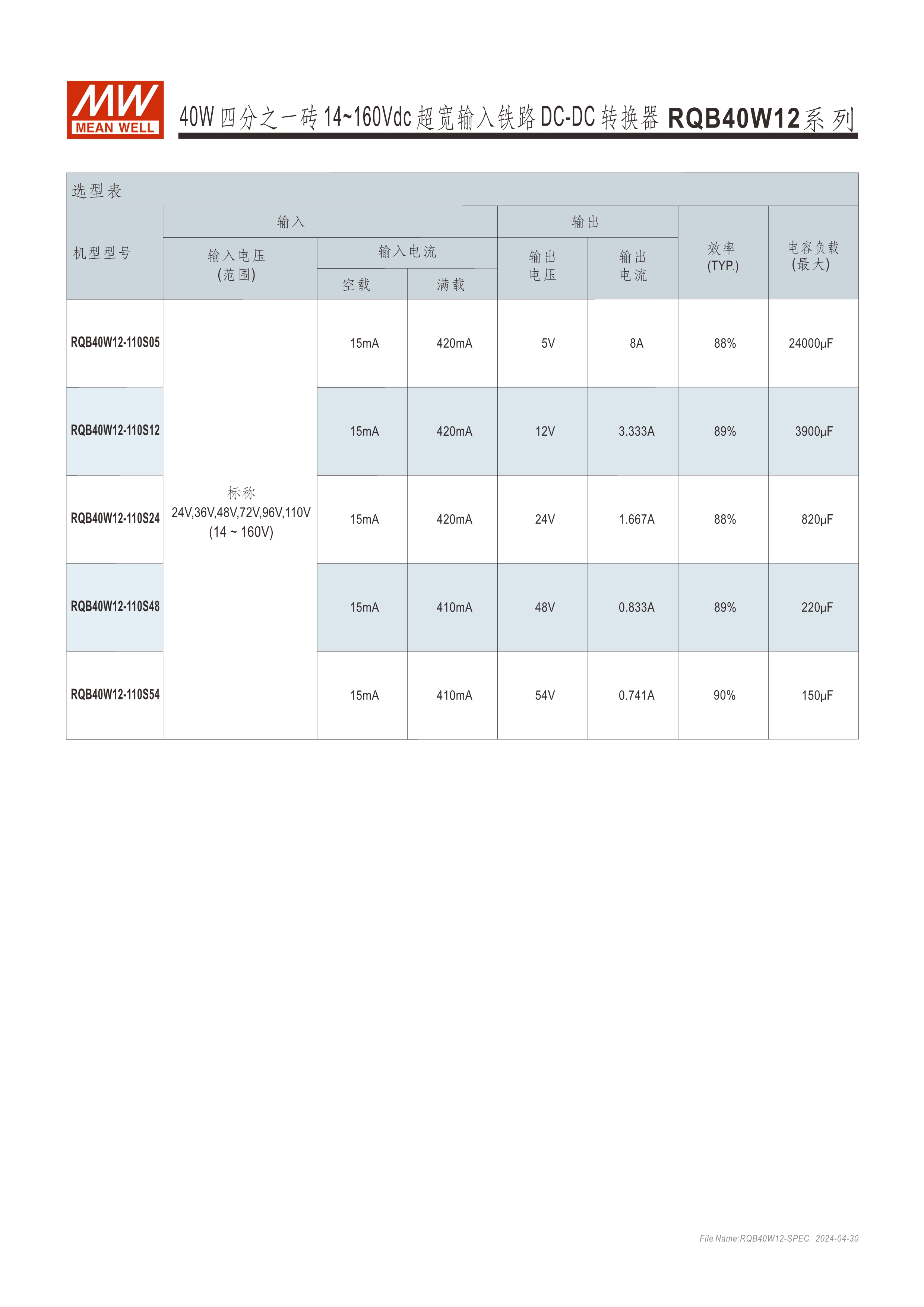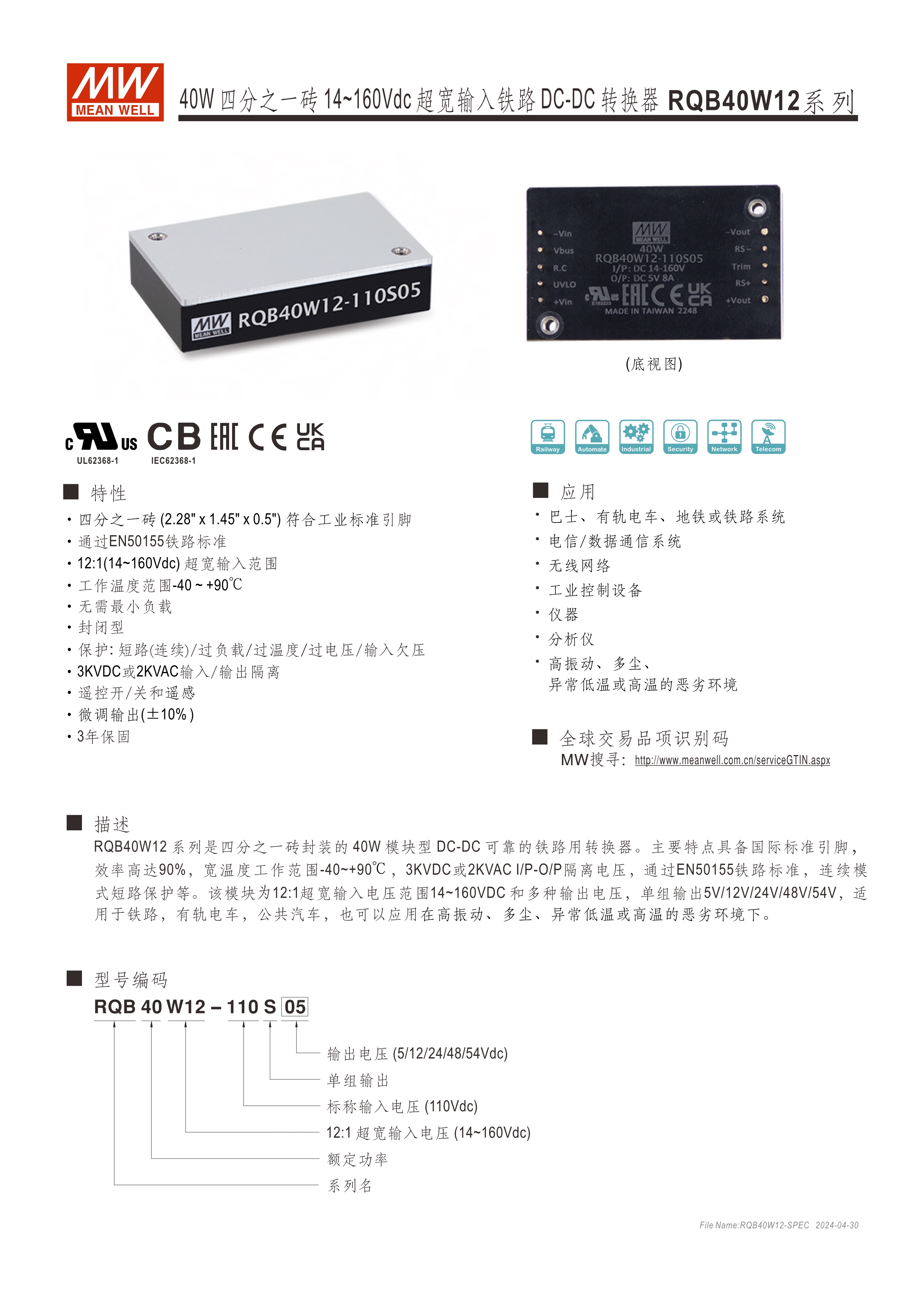 模塊型快選表 2.28” x 1.45” x 0.5”半磚尺寸 符合鐵路標(biāo)準(zhǔn)EN50155 40W: 12:1(14~160Vdc)超寬輸入范圍 ; 150W: 3:1(60~160Vdc)超寬輸入范圍 寬工作溫度范圍-40~+90oC 無(wú)需最低負(fù)荷 全封裝