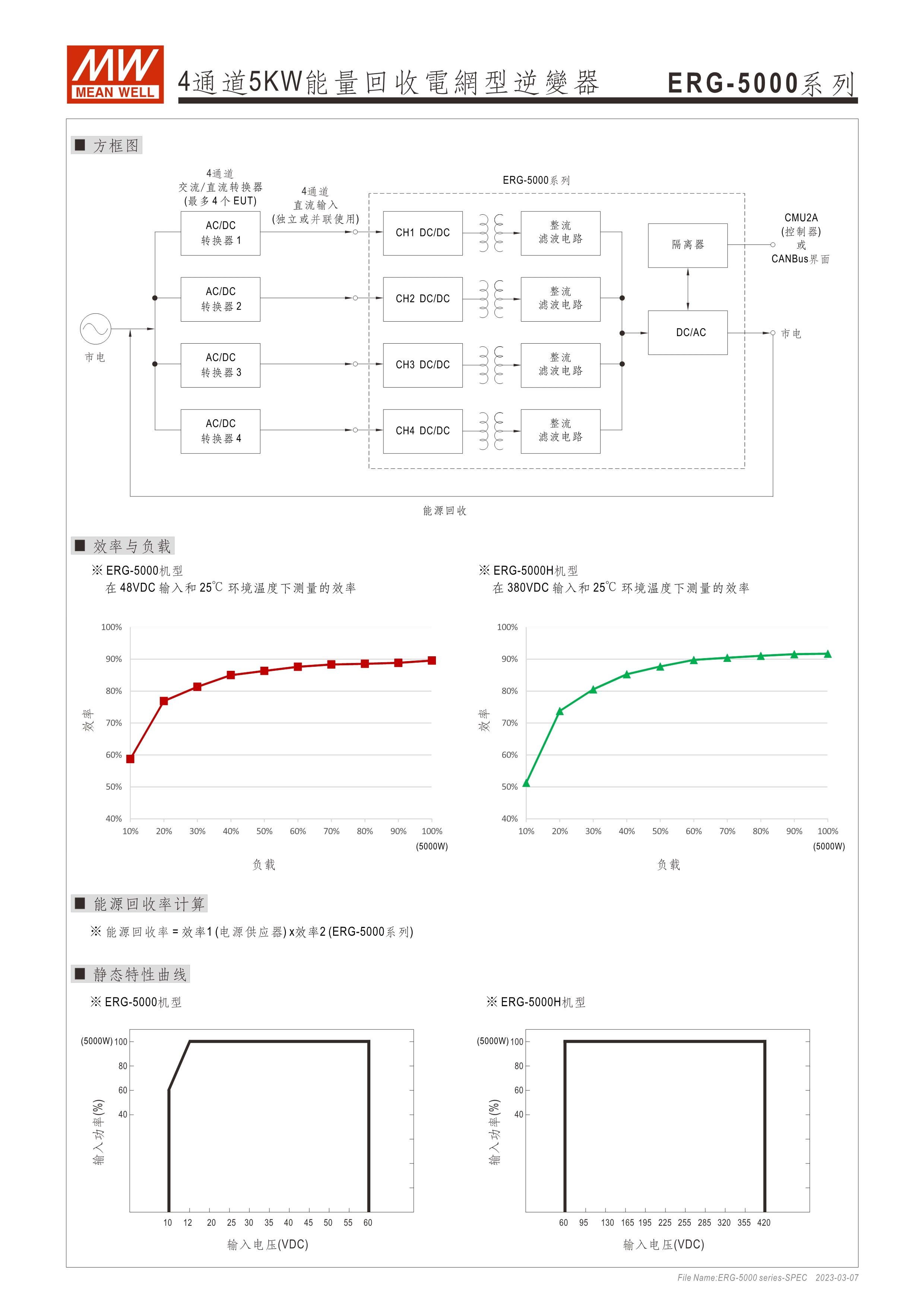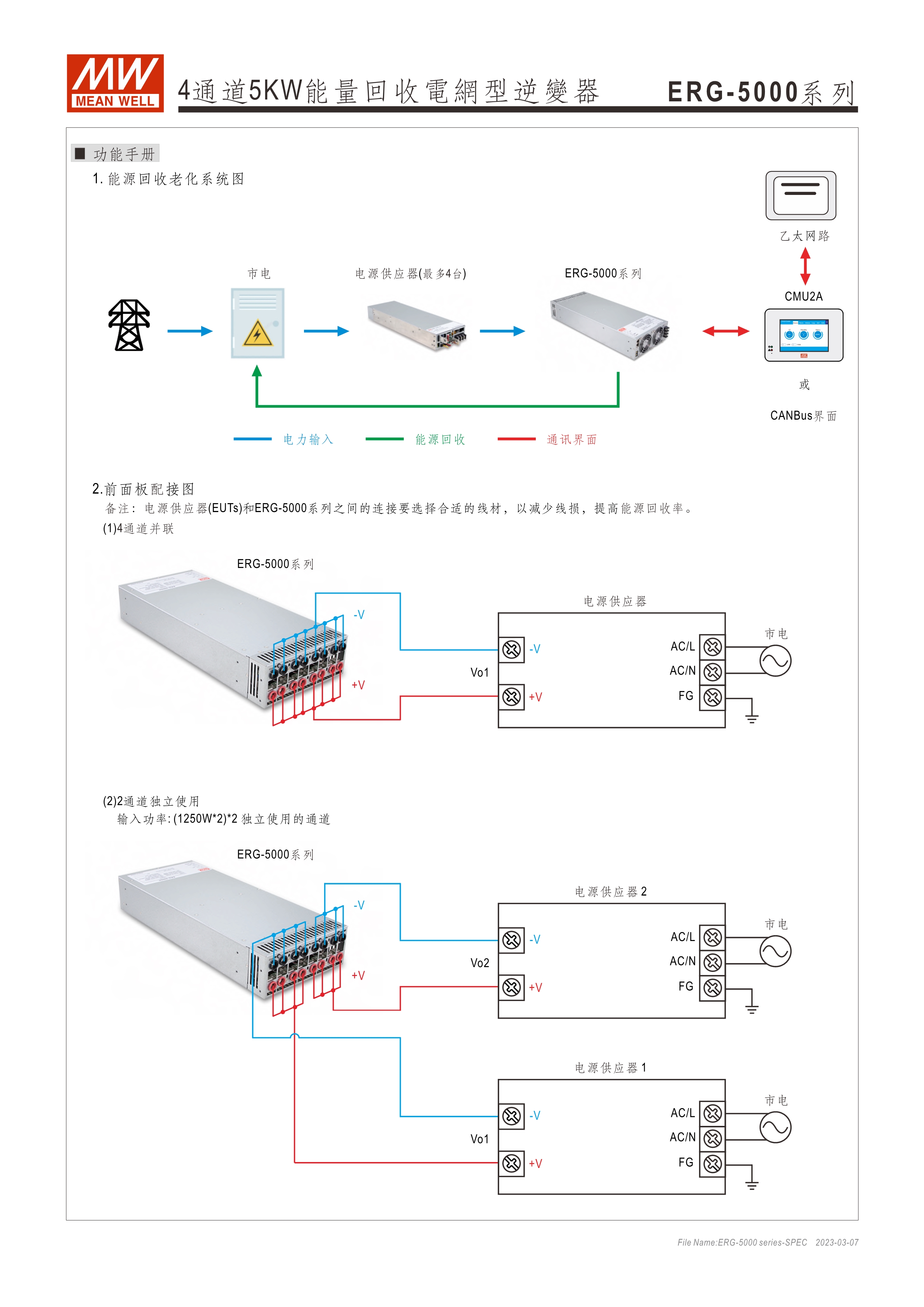 系統(tǒng)電源解決方案 (PDF) 寬輸入電壓范圍10~60VDC/寬輸入電壓范圍60~420VDC 效率高達(dá)91% 靈活配置的模塊化設(shè)計(jì) 彈性的CC/CV操作模式 通過CMU2A實(shí)現(xiàn)CAN總線協(xié)議遠(yuǎn)程控制和監(jiān)控控制 可連接最多64個(gè)ERG-5000系列 保護(hù)功能:過電壓、欠電壓、過熱、過功率、電網(wǎng)故障、過功率無輸入、通信錯(cuò)誤 3年保固