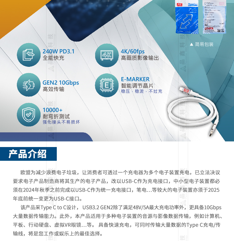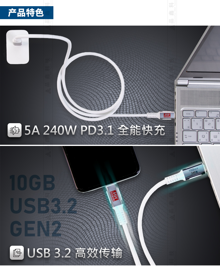 USB傳輸線 明緯聯(lián)源精密USB 3.2 GEN2 Type C 240W充電/傳輸線